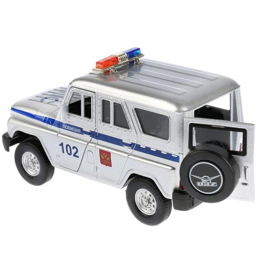 ТМ Технопарк. Machine en métal "UAZ HUNTER ПОЛИЦИЯ" 12 cm, sвет+звук, открыв. двери, инерц. dans le cor.2*36шт