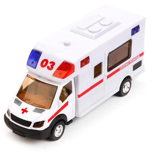 1022S-R 244952 МОДЕЛЬ "ТЕХНОПАРК" МЕТАЛЛ. ИНЕРЦ. СКОРАЯ ПОМОЩЬ, 17СМ, СВЕТ+ЗВУК, ОТКРЫВ. ДВЕРИ В К