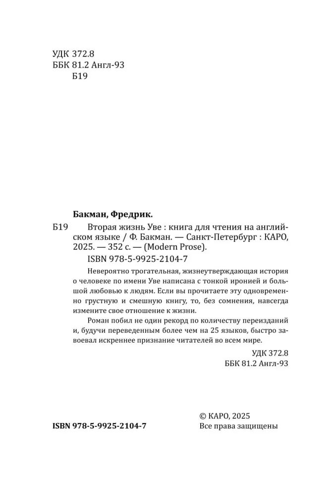 Handling time: 25 days Невероятно трогательная, жизнеутверждающая история о человеке по имени Уве написана с тонкой иронией и большой любовью к людям. Если вы прочитаете эту одновременно грустную и смешную книгу, то, без сомнения, навсегда измените свое отношение к жизни. Роман побил не один рекорд по количеству переизданий и, будучи переведенным более чем на 25 языков, быстро завоевал искреннее признание читателей во всем мире. English / художественная литература на английском / английские книги в оригинале / книги для начинающих читать на английском / книги на иностранных языках/ английский без репетитора / книги классика