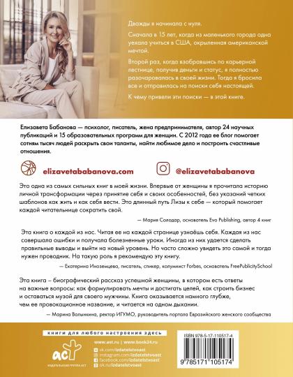 Elisaveta Babanovova – psychologue, psychologue, a présenté, auteur de 24 publications et de 15 programmes pour les femmes. En 2012, ce blog a permis à vos jeunes de découvrir leurs talents, de leur faire un travail et de publier leurs projets. отношения.Если вы Si tu es une femme, tu es une femme, tu es une femme – tu es dans les meilleures conditions pour les femmes, alors tu vas pouvoir les recevoir dans leurs livraisons. самых дерзких целей.«Дважды я начинала с нуля.Сначала в 15 лет, когда из маленького города одна уехала учиться в США, окрыленная américain мечтой.Второй раз, когда взобравшись по карьерной лестнице, получив деньги и STATUS, я полностью разочаровалась в своей жизни. Aujourd'hui, j'ai discuté avec nous et j'ai travaillé sur ces gens-là. Ils ont découvert ces gens – dans ce livre».