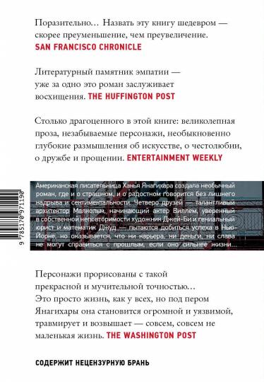 La même dame romaine à l'époque d'Alexandre Borisenko, Anastasie Zavozovo et Viktor Sonkina. Prix des finalistes du National Book Award - Premier prix Kirkus Prize - Книга года на AmazonАмериканская писательница Ханья Янагихара создала необычный роман, где и oh страшном, и о радостном говорится без лишнего надрыва и сентиментальности. Le duo principal - l'archéologue talentueux Malcolm, l'acteur principal Villelem, s'est rendu dans le plus grand secret de l'homme de métier de Djé-Bien et un spécialiste et un spécialiste en mathématiques de Djoud - ils doivent travailler à l'Île-du-Prince-Édouard, mais ils ne s'attendent pas à ce qu'ils soient transporteurs, ni enfants, ni esclaves. je peux справиться с прошлым, если оно сильнее жизни…Книга содержит нецензурную брань.Об авторе:Ханья Янагихара родилась в Los Angeles, 1974 année. L'université du Collège SMITH, spécialisée dans les affaires féminines, s'est engagée dans le Massachusetts, et переехала в New York, il a travaillé comme agent pour s'occuper de sa mission, dans le journal Conde Nast Traveler. Le rédacteur en chef du New York Times Style Magazine, en 2015, a publié un travail dans le journal T: The New York Times Style Magazine, qui a ensuite parlé de « Malenьkoy жизни», оставила и эту должность.Цитата:"Выражение tour de force словно специально придумано для этого невероятно смелого романа." Kirkus ReviewsТеги:Бестселлер, большой американский роман, Маленькая жизнь, Завозова