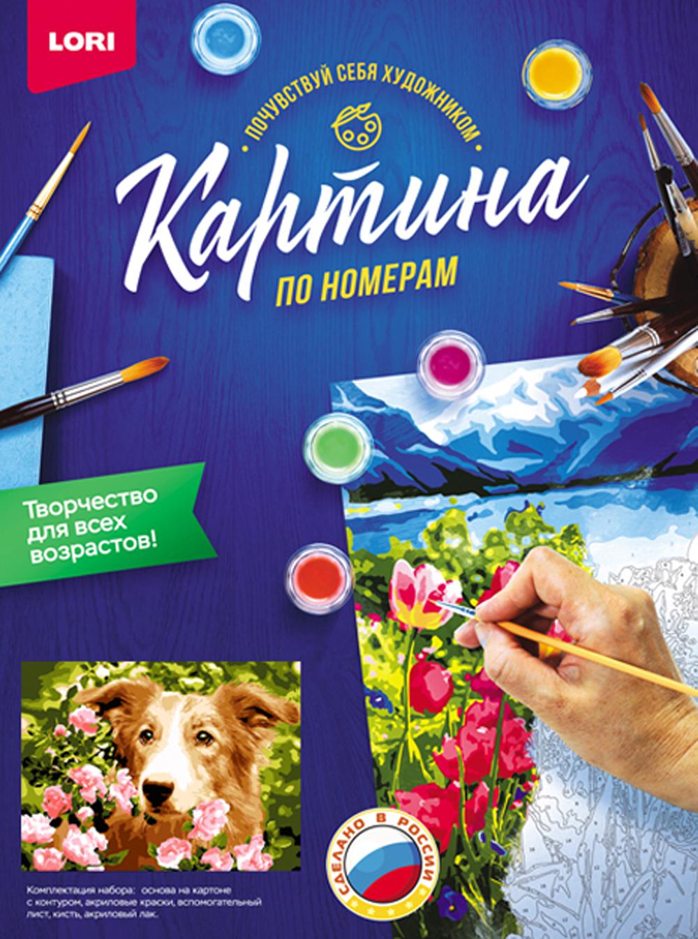 Le jeu "Набор для творчества раскраска по номерам" Собака в цветах" в кор.18шт". Objet : LORI. Date de début : 2021. Série : Почувствуй себя художником. Norme : 18.