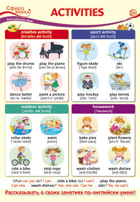 Плакат поможет быстро и наглядно освоить лексическую тему, связанную с различными видами занятий детей: творческими, спортивными, занятиями на свежем воздухе и по ведению домашнего хозяйства. Lorsque vous voyez la plaque de données d'activité, le modèle de mise en œuvre des relations et des relations professionnelles, qui permet de créer un service avant-première разных грамматических конструкций с глаголом peut : вопросительные, утвердительные, отрицательные, а затем и целый рассказ.