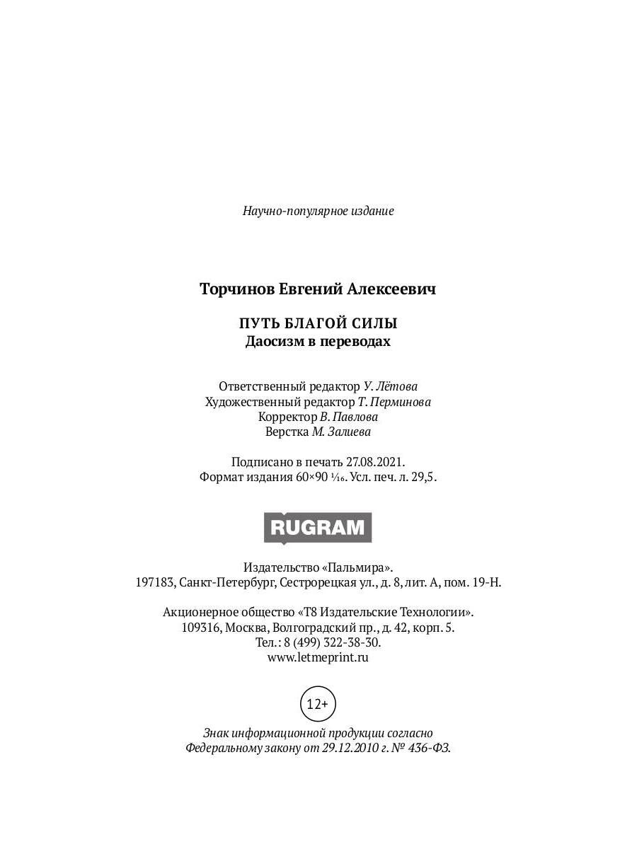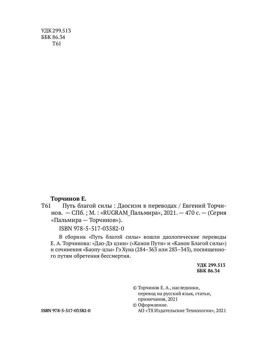 Автор: Торчинов Евгений, «Путь благой силы. Даосизм в переводах»: В сборник «Путь благой силы» вошли даологические переводы Е. А. Торчинова: «Дао-Дэ цзин» («Канон Пути» и «Канон Благой силы») и сочинения «Баопу-цзы» Гэ Хуна (284–363 или 283–343), посвященного путям обретения бессмертия.
