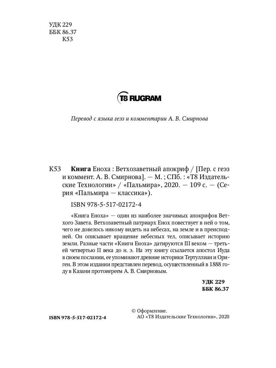 «Книга Еноха. Ветхозаветный апокриф»: «Книга Еноха» — один из наиболее значимых апокрифов Ветхого Завета. Le patriarche vétéran Enoch s'est engagé dans un avenir proche, mais il n'a jamais fait de vidéo pour lui, à l'époque et à l'avance. Selon l'histoire d'un tel téléphone, l'histoire est connue. Разные части «Книги Еноха» датируются III веком — третьей четвертью II века до н. e. Dans cet ouvrage, l'apôtre Juda a été nommé dans son poste, et il a écrit l'histoire de Tertullian et d'Origène. C'est pour cette raison que le précédent projet a eu lieu en 1888 dans le projet Kasani A.В. Смирновым.