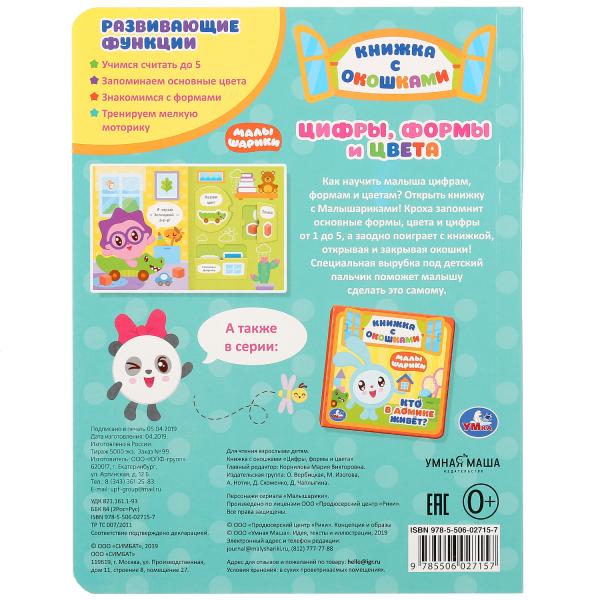 Книжка с окошками «Цифры, формы и цвета. Малышарики» ТМ «УМка» станет прекрасным подарком для ребёнка.
