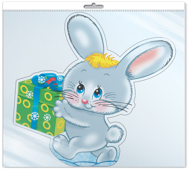 *ФМ-14453 ПЛАКАТ ВЫРУБНОЙ А4 В ПАКЕТЕ. Зайчик с подарком (УФ-lac, в индивидуальной упаковке, с европодвесом и клеевым клапаном)