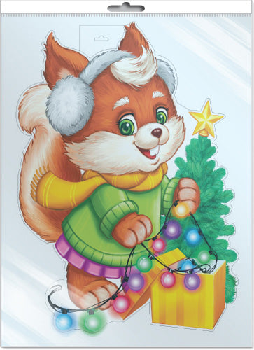 *Ф-16581 ПЛАКАТ ВЫРУБНОЙ А3 В ПАКЕТЕ. Белочка с гирляндой и елочкой (двухсторонний, ВД-lac, в индивидуальной упаковке, с европодвесом и клеевым клапаном)