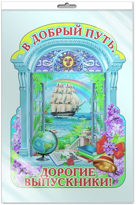 *Ф-7341-П ПЛАКАТ ВЫРУБНОЙ А3 В ПАКЕТЕ. В добрый путь, дорогие выпускники! (С блестками в индивидивидуальной упаковке с европодвесом и клеевым клапаном)