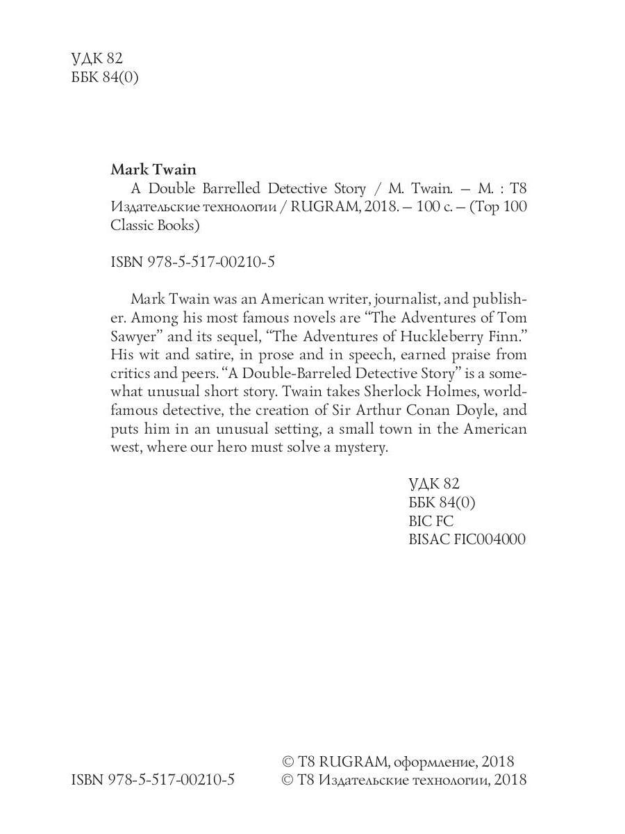 Auteur : Twain M., « A Double Barrelled Detective Story » : Mark Twain était un écrivain, journaliste et éditeur américain. Parmi ses romans les plus célèbres figurent « Les Aventures de Tom Sawyer » et sa suite, « Les Aventures de Huckleberry Finn ». Son esprit et sa satire, en prose comme à l'oral, lui ont valu les éloges de la critique et de ses pairs. « A Double Barrelled Detective Story » est une nouvelle quelque peu inhabituelle. Twain prend Sherlock Holmes, détective mondialement connu, créé par Sir Arthur Doyle, et le place dans un décor inhabituel, une petite ville de l'Ouest américain, où notre héros doit résoudre un mystère.