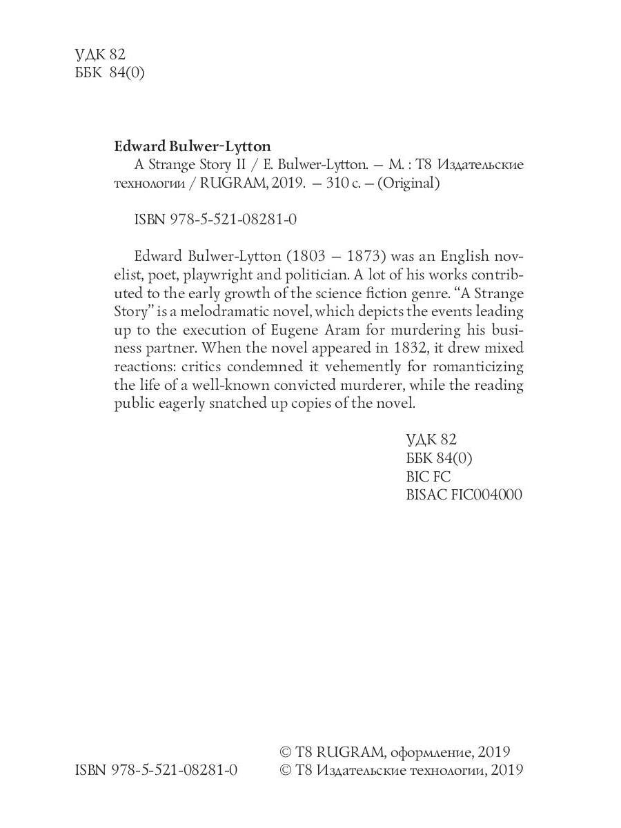 Auteur : Bulwer-Lytton E., « A Strange Story 2 = Странная история » : Edward Bulwer-Lytton (1803 — 1873) était un romancier, poète, dramaturge et homme politique anglais. Nombre de ses œuvres ont contribué à l'essor du genre de la science-fiction. « A Strange Story » est un roman mélodramatique qui décrit les événements qui ont conduit à l'exécution d'Eugène Aram pour le meurtre de son associé. À sa parution en 1832, le roman a suscité des réactions mitigées : les critiques l'ont vivement condamné pour avoir romancé la vie d'un célèbre meurtrier condamné, tandis que les lecteurs se sont rués sur le roman.