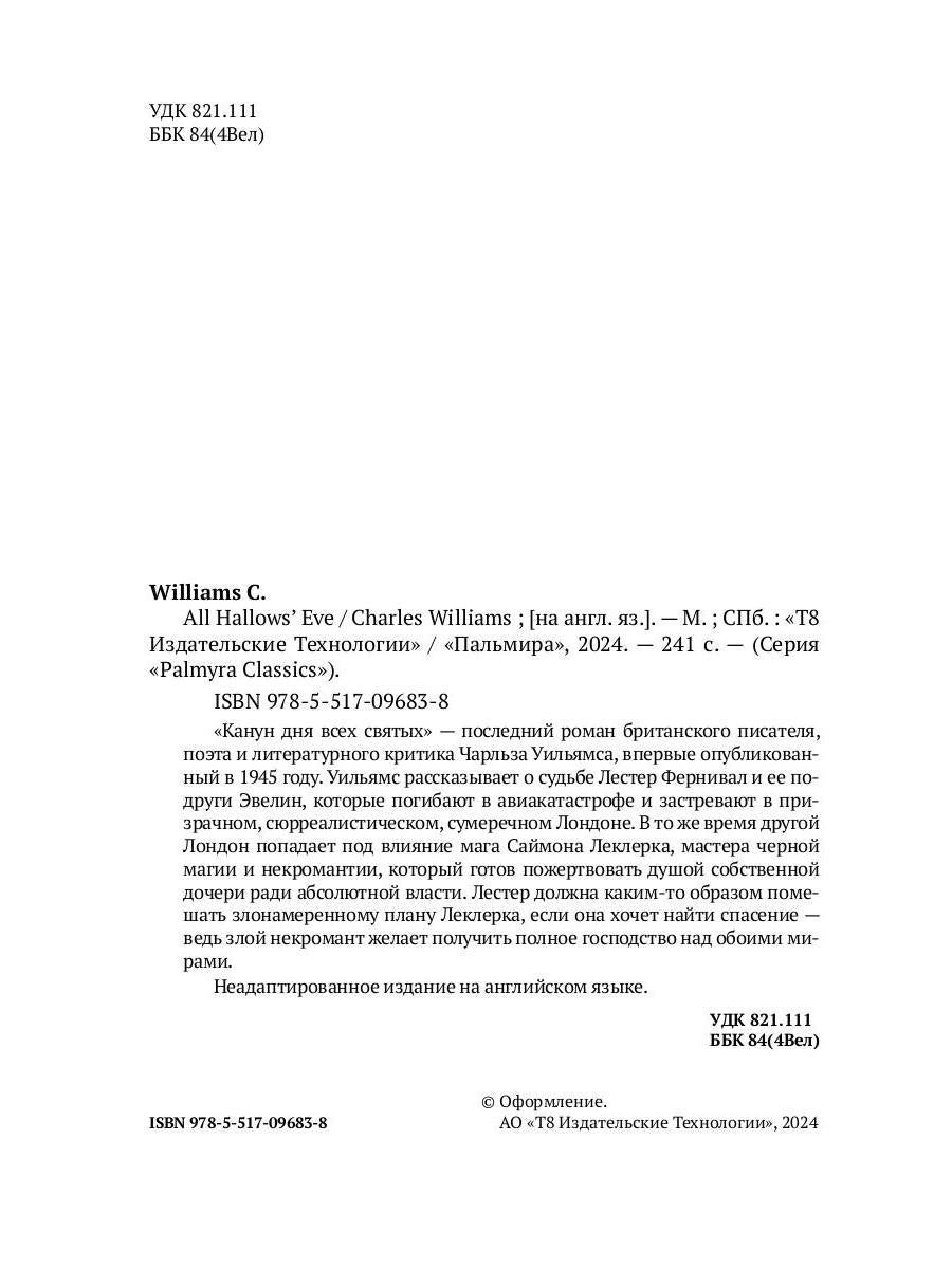 Auteur: Вильямс Ч., «All Hallows' Eve: на англ.яз»: "Канун дня всех святых" - последний роман британского писателя, поэта и литературного critique Karlza Juliana est devenue publique en 1945. Il s'est occupé du sud-africain Lester Fernival et de son épouse Eveline, qui s'est lancée dans l'aviation et s'est engagée dans le projet, C'est surréaliste, c'est vraiment Londres. Lors de cette dernière journée de Londres, le magicien Saïmona Leclerc, maître de la magie noire et du nécromantisme, a créé des hôtels. пожертвовать душой собственной дочери ради абсолютной власти. Il suffit de s'occuper du plan de travail de la secrétaire, si ce n'est pour son propre espace - voir un nécromant получить полное господство над обоими мирами. Une idée intéressante pour le jeune anglais.