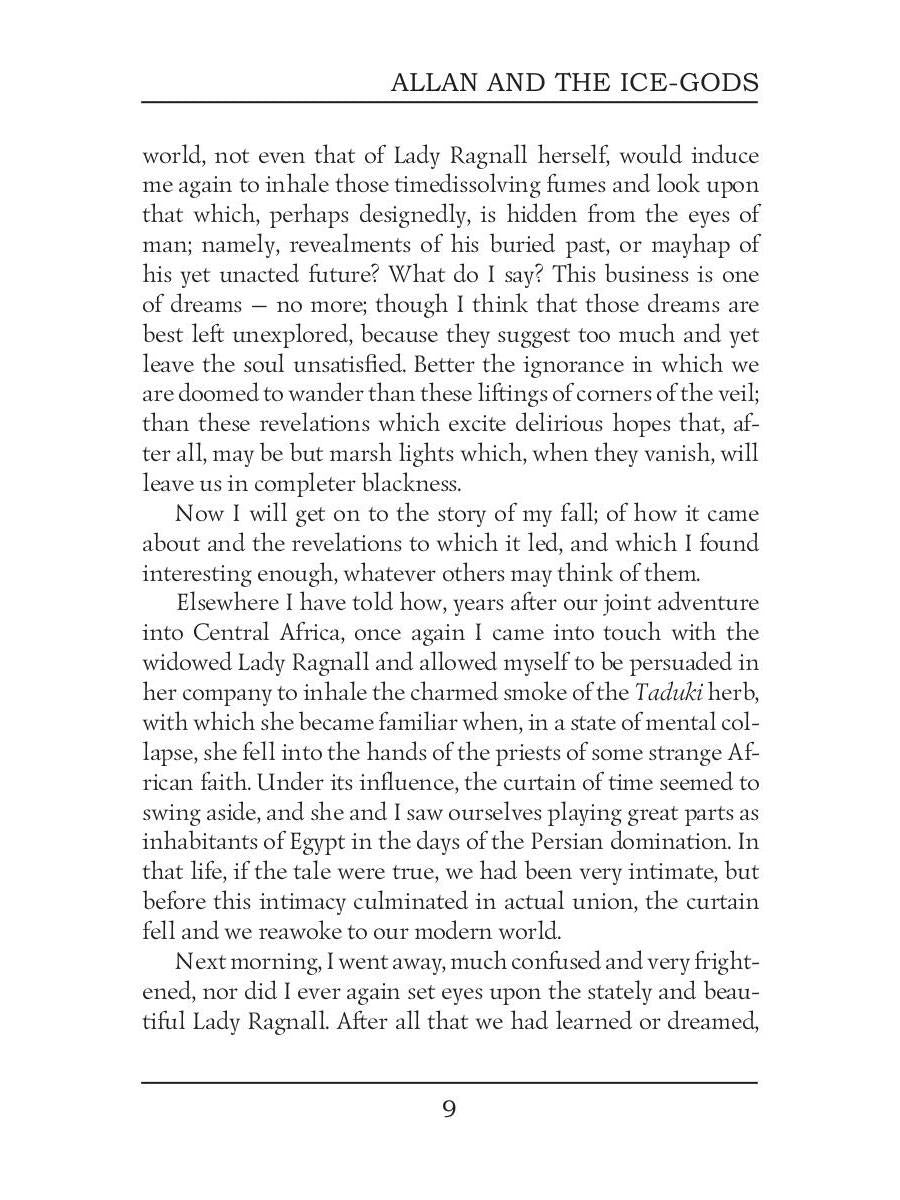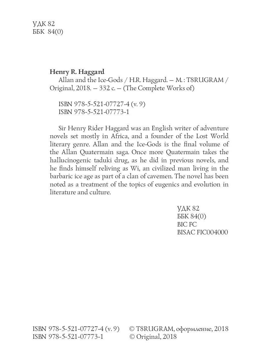 Auteur : Haggard HR, « Allan et les Dieux de Glace = Аллан и Ледяные Боги: на англ.яз » : Sir Henry Rider Haggard était un écrivain anglais de romans d'aventures se déroulant principalement en Afrique, et l'un des fondateurs du genre littéraire du Monde Perdu. Allan et les Dieux de Glace est le dernier volume de la saga d'Allan Quatermain. Une fois de plus, Quatermain prend la drogue hallucinogène taduki, comme il l'avait fait dans les romans précédents, et il se retrouve à revivre en tant que Wi, un homme civilisé vivant à l'ère glaciaire barbare au sein d'un clan d'hommes des cavernes. Le roman a été noté comme un traitement des thèmes de l'eugénisme et de l'évolution dans la littérature et la culture.