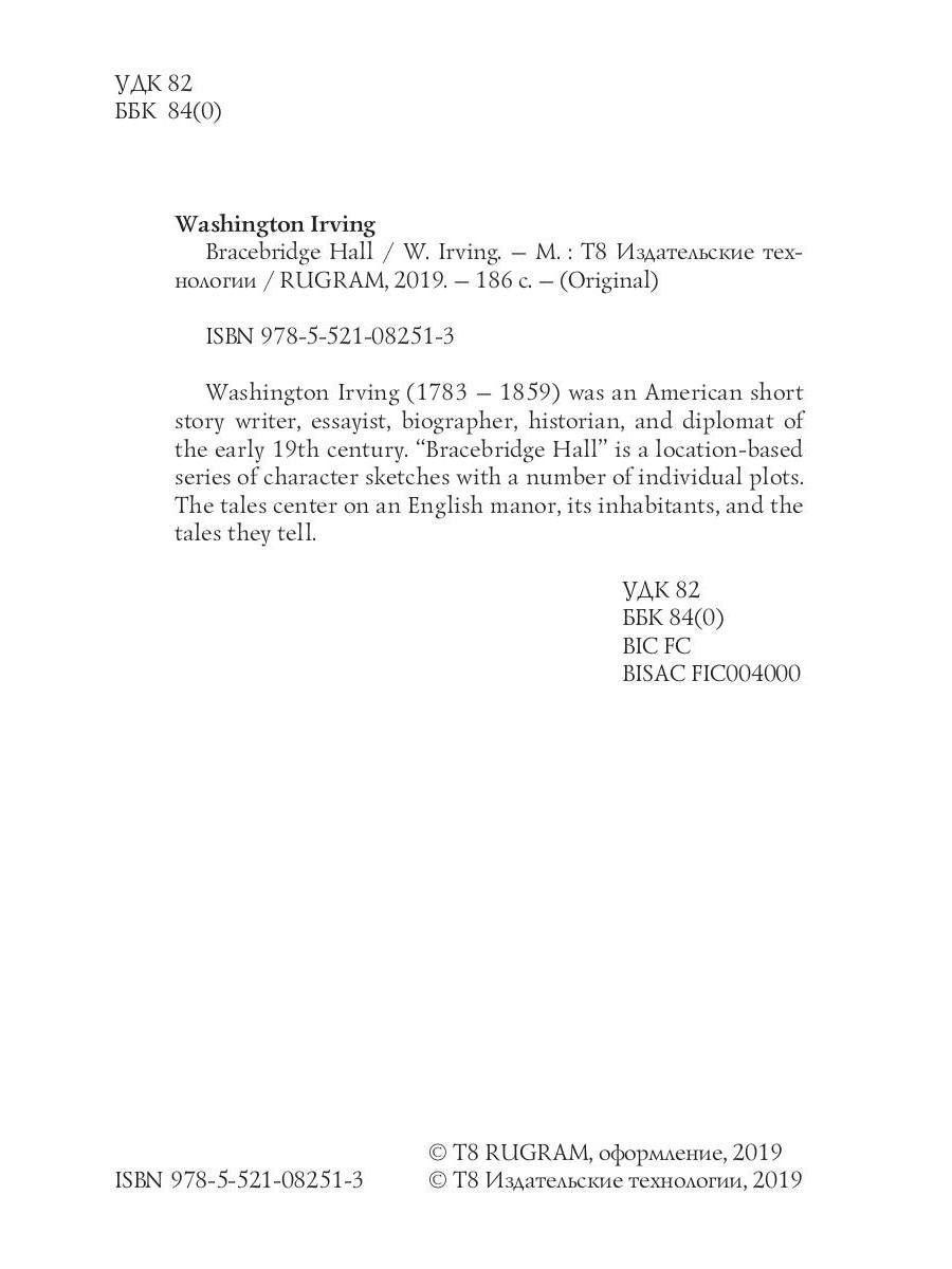 Auteur : Irving W., « Bracebridge Hall = Брейсбридж-холл » : Washington Irving (1783 — 1859) était un nouvelliste, essayiste, biographe, historien et diplomate américain du début du XIXe siècle. « Bracebridge Hall » est une série de portraits de personnages, basés sur des lieux précis et s'articulant autour d'intrigues individuelles. Les récits se concentrent sur un manoir anglais, ses habitants et les récits qu'ils racontent.