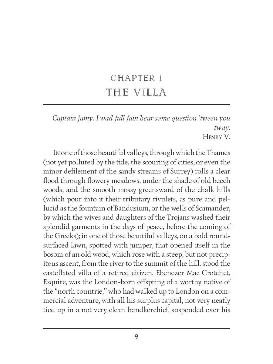 Auteur : Peacock TL, « Crotchet Castle » : Thomas Love Peacock était un romancier, poète et fonctionnaire anglais de la Compagnie des Indes orientales. Dans « Crotchet Castle », l'auteur rassemble un groupe d'excentriques, chacun animé d'une obsession monomaniaque, et tire humour et satire sociale de leurs diverses interactions et conversations.