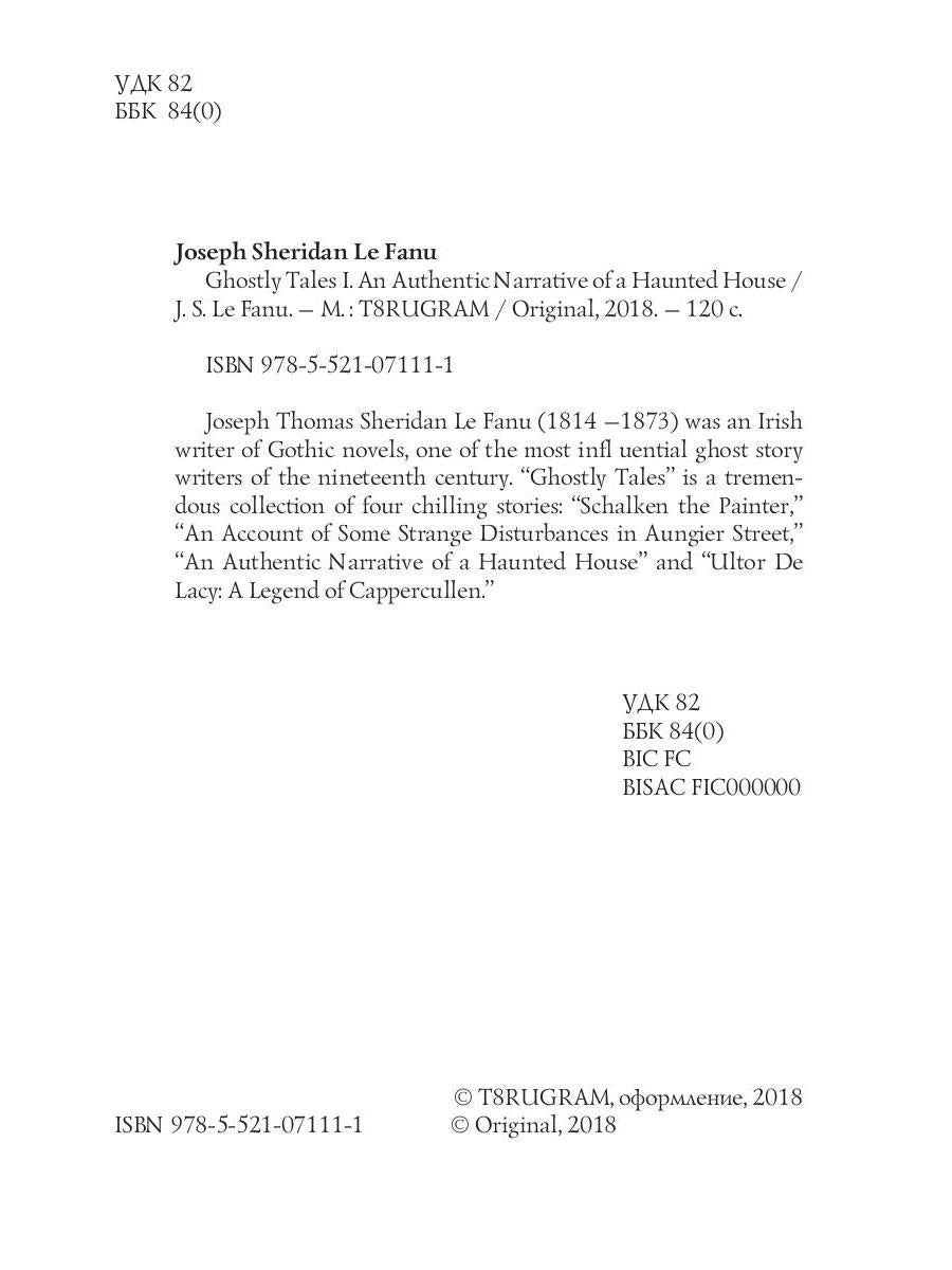 Auteur : Le Fanu JS, « Ghostly Tales 1. An Authentic Narrative of a Haunted House = Рассказы о призраках 1: на англ.яз » : Joseph Thomas Sheridan Le Fanu (1814-1873) était un écrivain irlandais de romans gothiques, l'un des écrivains d'histoires de fantômes les plus influents du XIXe siècle. "Ghostly Tales" est une formidable collection de quatre histoires effrayantes : "Schalken le peintre", "Un récit de quelques étranges perturbations dans la rue Aungier", "Un récit authentique d'une maison hantée" et "Ultor De Lacy : Une légende de Cappercullen".