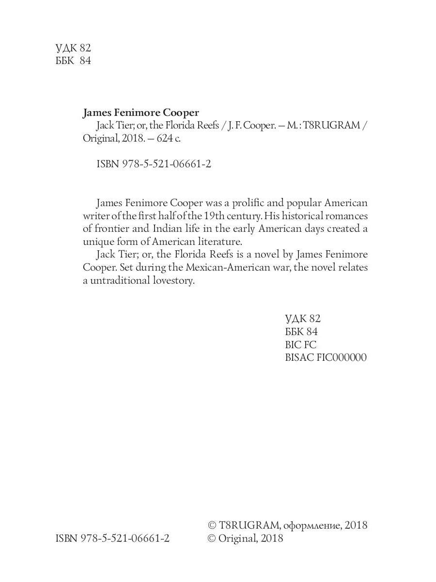 Auteur : Cooper JF, « Jack Tier ; ou les récifs de Floride = Джек Тайер, или Флоридский риф: роман на англ.яз » : James Fenimore Cooper était un écrivain américain prolifique et populaire de la première moitié du XIXe siècle. Ses romans historiques sur la vie des Indiens et des habitants de la frontière aux débuts de l'Amérique ont créé une forme unique de littérature américaine. Jack Tier ; ou les récifs de Floride est un roman de James Fenimore Cooper. Se déroulant pendant la guerre américano-mexicaine, le roman raconte une histoire d'amour non traditionnelle.