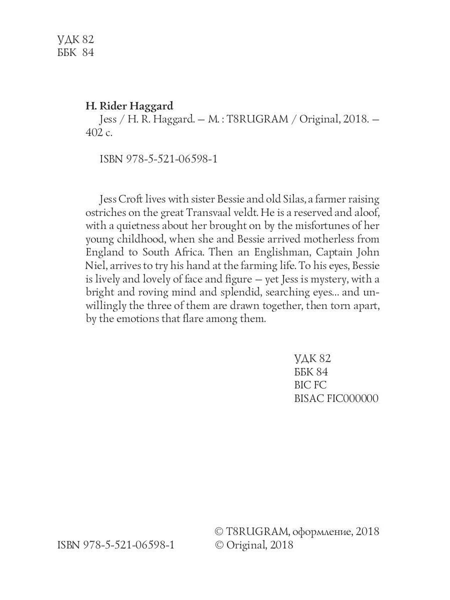 Auteur : Haggard HR, « Jess = Jess : sur l'ange. » : Jess Croft vit avec sa sœur Bessie et le vieux Silas, un fermier qui élève des autruches dans le grand veldt du Transvaal. Il est réservé et distant, avec une tranquillité due aux malheurs de sa jeune enfance, lorsqu'elle et Bessie sont arrivées orphelines d'Angleterre en Afrique du Sud. Puis un Anglais, le capitaine John Niel, arrive pour s'essayer à la vie de fermier. À ses yeux, Bessie est vive et belle de visage et de silhouette - pourtant Jess est mystérieuse, avec un esprit vif et vagabond et un regard splendide et scrutateur... et malgré eux, tous trois sont attirés l'un vers l'autre, puis déchirés, par les émotions qui les embrasent.