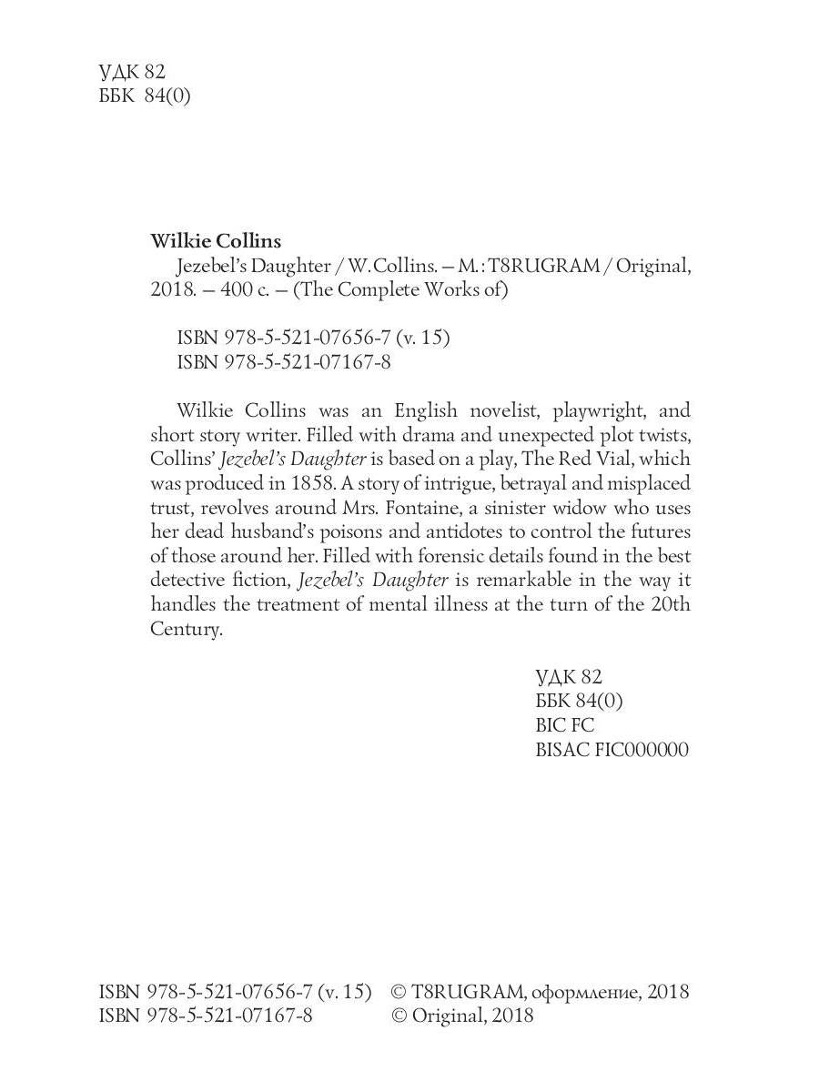 Auteur : Collins William Wilkie, « Jezebel's Daughter = Дочь Иезавели (на английском языке) » : Wilkie Collins était un romancier, dramaturge et nouvelliste anglais. Rempli de drames et de rebondissements inattendus, Jezebel's Daughter de Collins est basé sur une pièce de théâtre, The Red Vial, jouée en 1858. Une histoire d'intrigue, de trahison et de confiance mal placée, tourne autour de Mme Fontaine, une veuve sinistre qui utilise les poisons et les antidotes de son défunt mari pour contrôler l'avenir de ceux qui l'entourent. Rempli de détails médico-légaux que l'on retrouve dans les meilleurs romans policiers, La Fille de Jézabel est remarquable dans la manière dont il traite du traitement des maladies mentales au tournant du XXe siècle.