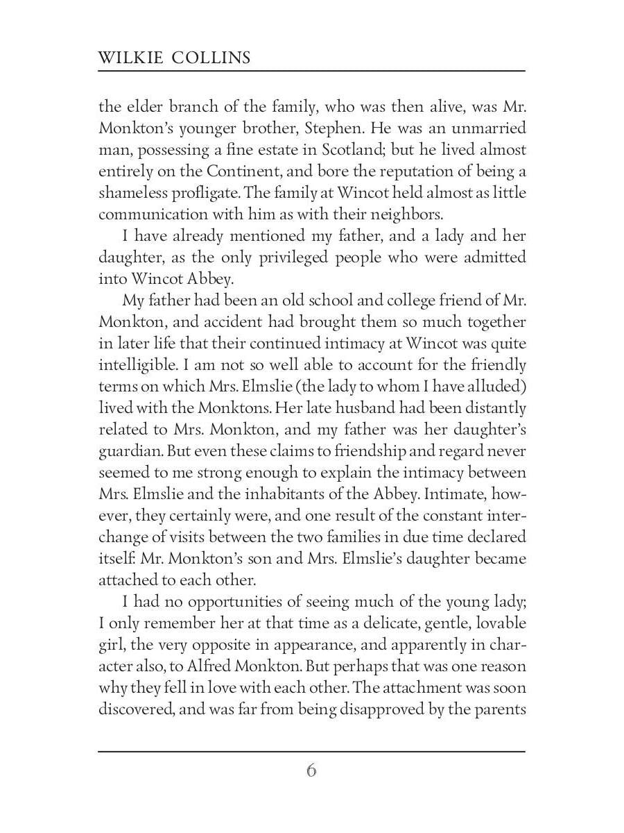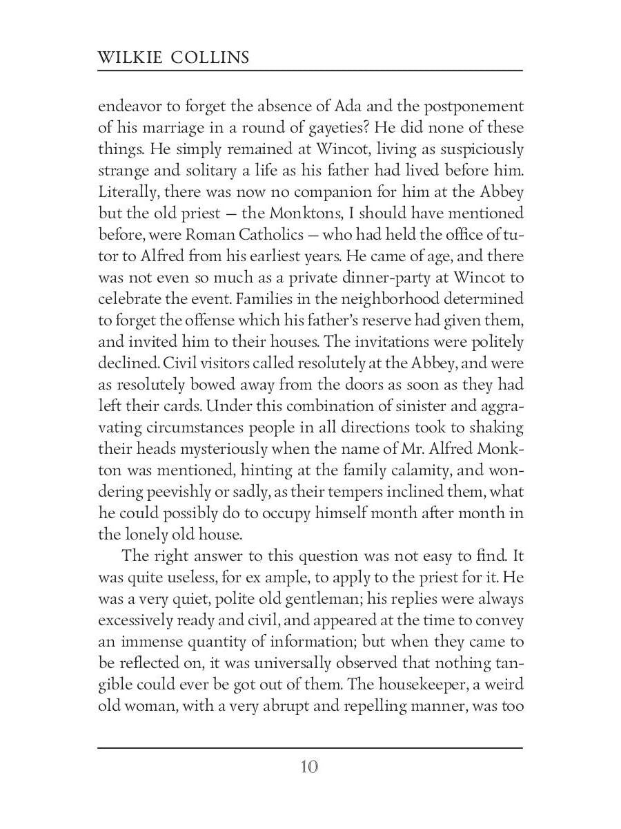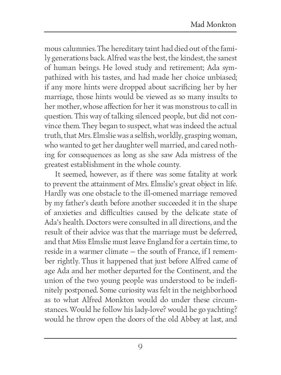Auteur : Collins William Wilkie, « Mad Monkton = Monkton sans vie (sur l'anglicanisme) » : William Wilkie Collins était un romancier, dramaturge et nouvelliste anglais. Mad Monkton est une étrange histoire de fantômes. On raconte qu'une forme de folie héréditaire ronge la famille Monkton, héritière de l'immense domaine de l'abbaye de Wincot. Des rumeurs dans le quartier disent qu'Alfred, le plus jeune descendant, a hérité de cette folie. Il est fiancé à son amour d'enfance, Ada Elmslie. Cependant, Alfred part soudainement pour l'Italie, à la recherche du corps de son oncle peu recommandable, qui aurait été tué en duel.