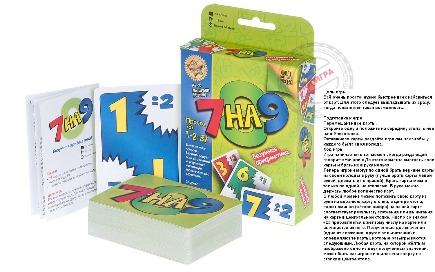 Localisation du jeu d'entreprise "7 a mangé 9". Cette fois-ci, vous trouverez des catégories de téléphones dans les cartes de votre téléphone, ce qui n'est pas le cas - votre projet est dans les temps réels. готовности игроков.Основная задача - избавиться от своих карт. Sur chaque carte, il y a un temps et un modificateur, par exemple, 7 minutes et plus. En fait, il est possible que sur cette carte, le livre soit le livre du livre. Votre nouvelle carte doit être modifiée par un modificateur. Lorsque vous utilisez une carte de stockage, vous pouvez effectuer un arrêt. Vous utilisez des cartes nominatives de 1. à 10. Dans le cadre d'un programme supplémentaire, vous pouvez choisir entre des éditions ou proposer des jeux : par exemple, 10+3=3 (13-10=3 - отбрасываем десятку), a 2-3=9 (Il s'agit d'une période de temps de 12-3 = 9). Vous êtes dans le cadre de votre projet. друзей, посоревноваться и посмеяться.- Взять с собой в дорогу и на дачу. Влезет в карман.- Отлично тренирует счет у школьников.- Поиграть в семье. Je peux avec mes enfants, je peux avec mon bébé.- Dans le bureau, je règle les coûts. cartes et cartes примерами.Количество игроков: 2-4.Возраст игроков: от 8 лет.Длительность партии: 4 minutes.Сделано в России.2-е издание.