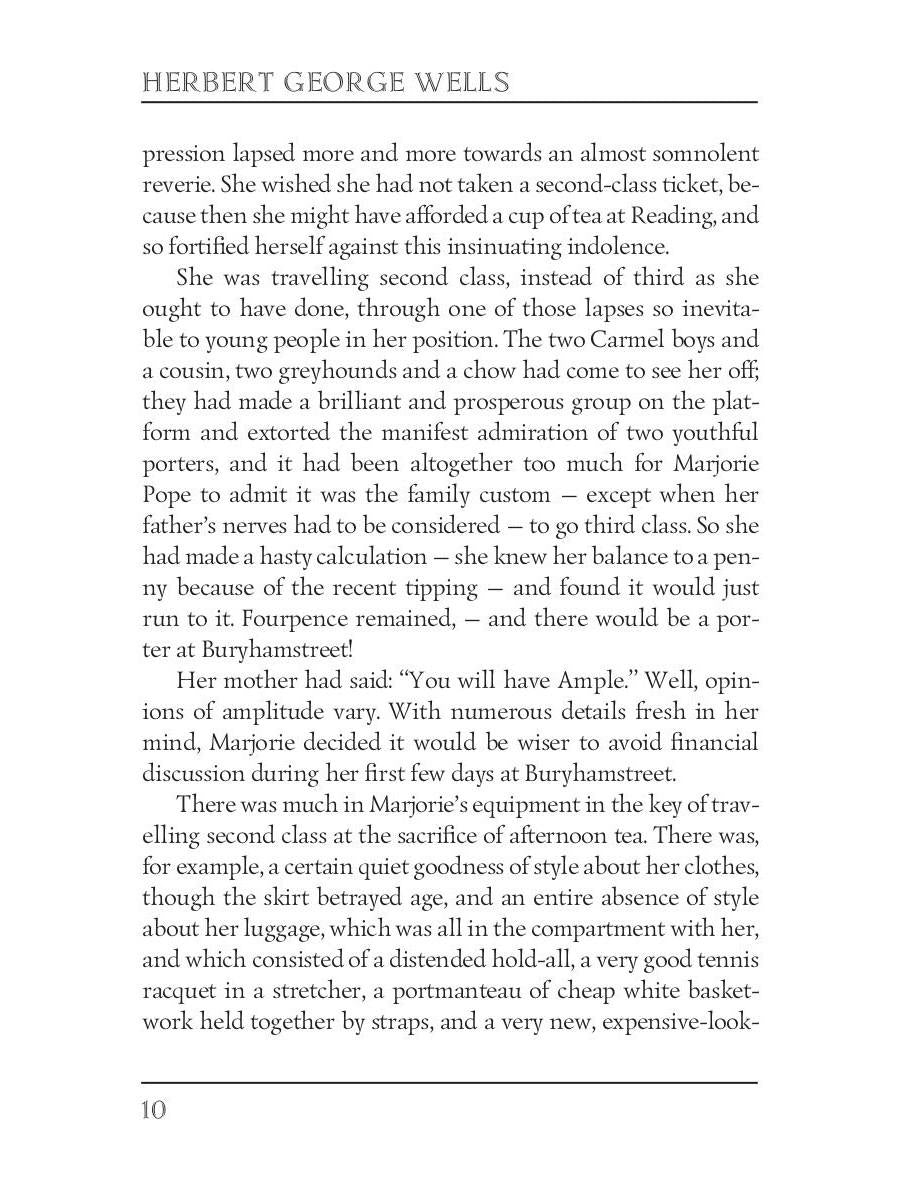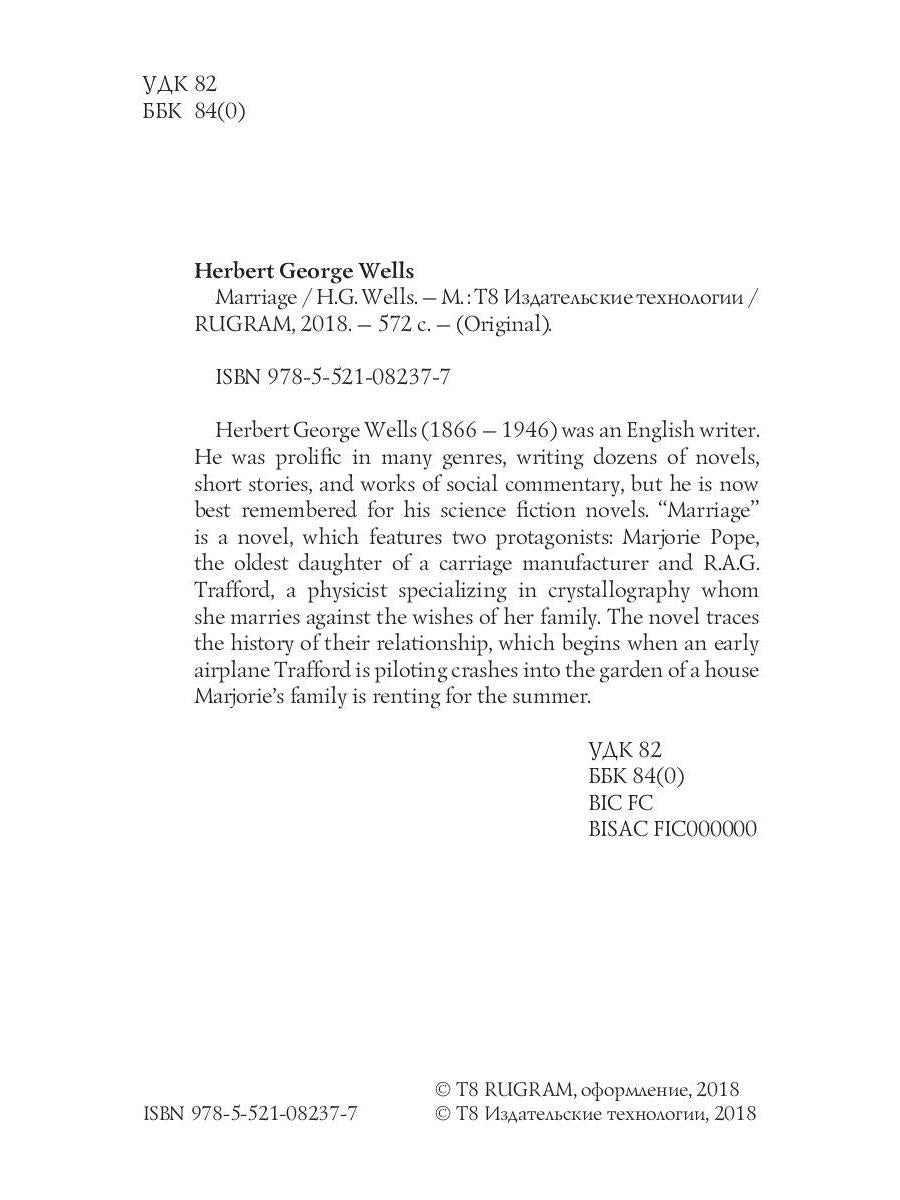 Auteur : Wells Herbert George, « Marriage = Брак: на англ.яз » : Herbert George Wells (1866 — 1946) était un écrivain anglais. Prolifique dans de nombreux genres, il a écrit des dizaines de romans, de nouvelles et d'ouvrages de critique sociale, mais il est aujourd'hui surtout connu pour ses romans de science-fiction. « Marriage » est un roman qui met en scène deux protagonistes : Marjorie Pope, la fille aînée d'un fabricant de voitures, et RAG Trafford, un physicien spécialisé en cristallographie qu'elle épouse contre la volonté de sa famille. Le roman retrace l'histoire de leur relation, qui commence lorsqu'un avion des premiers temps, piloté par Trafford, s'écrase dans le jardin d'une maison que la famille de Marjorie loue pour l'été.