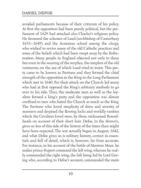 Auteur : Defoe D., « Mémoires d'un cavalier. Mémoires d'un cavalier. T. 12 : sur l'angleterre » : Daniel Defoe était un commerçant, écrivain, pamphlétaire et journaliste anglais. Il est surtout connu pour son roman « Robinson Crusoé », deuxième plus grand nombre de traductions après la Bible. Les Mémoires d'un cavalier est une œuvre de fiction historique se déroulant pendant la guerre de Trente Ans et les guerres civiles anglaises. Le grand talent d'écrivain de Daniel Defoe résidait dans sa capacité à parler à la manière des autres. L'authenticité de ces mémoires d'un soldat de fortune du XVIIe siècle était telle qu'elles furent considérées comme authentiques pendant plus d'un demi-siècle.