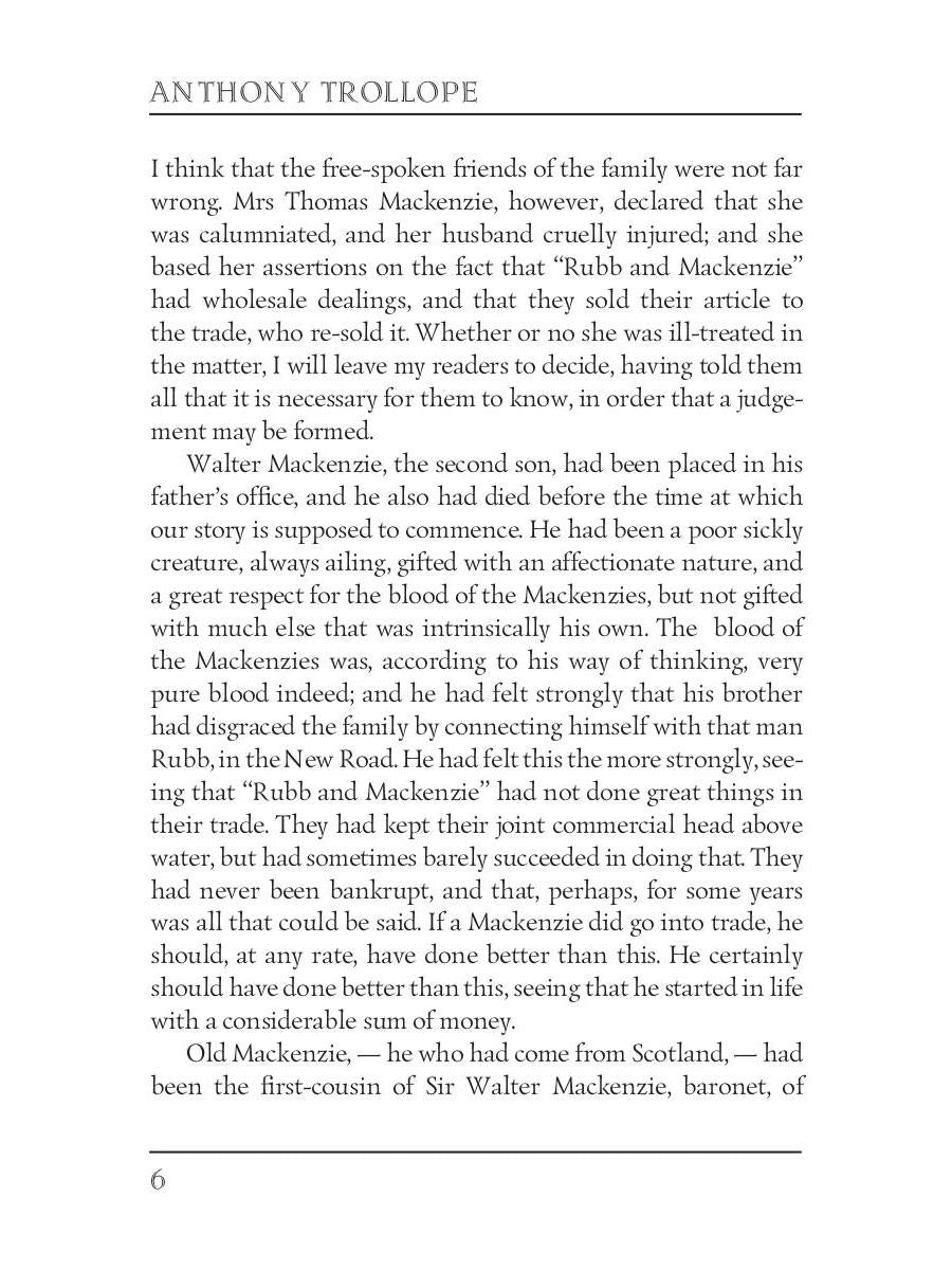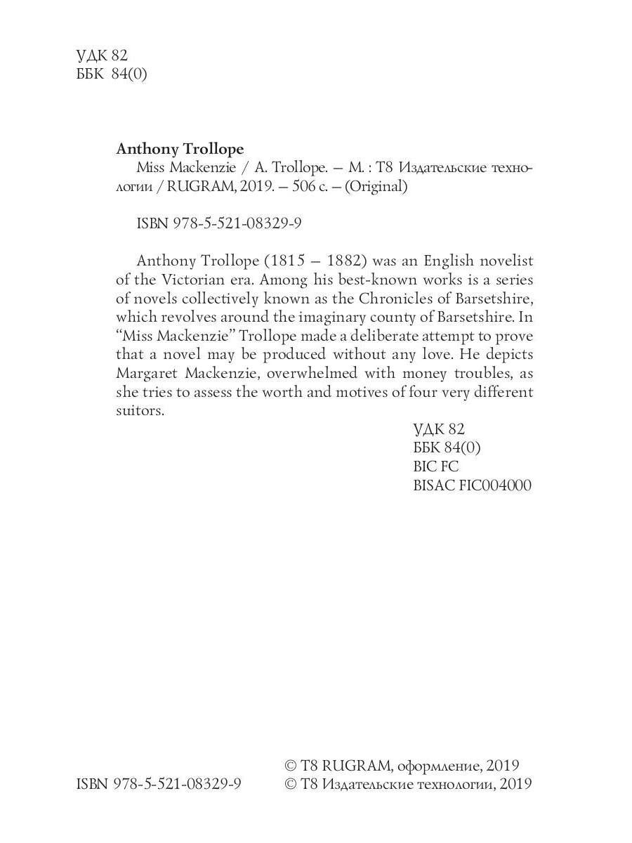 Auteur : Trollope A., « Miss Mackenzie = Мисс Макензи » : Anthony Trollope (1815 - 1882) était un romancier anglais de l’époque victorienne. Parmi ses œuvres les plus célèbres figure une série de romans, collectivement connus sous le nom des Chroniques du Barsetshire, qui se déroulent dans le comté imaginaire de Barsetshire. Dans « Miss Mackenzie », Trollope tente délibérément de prouver qu’un roman peut être écrit sans amour. Il y dépeint Margaret Mackenzie, accablée de problèmes financiers, alors qu’elle tente d’évaluer la valeur et les motivations de quatre prétendants très différents.