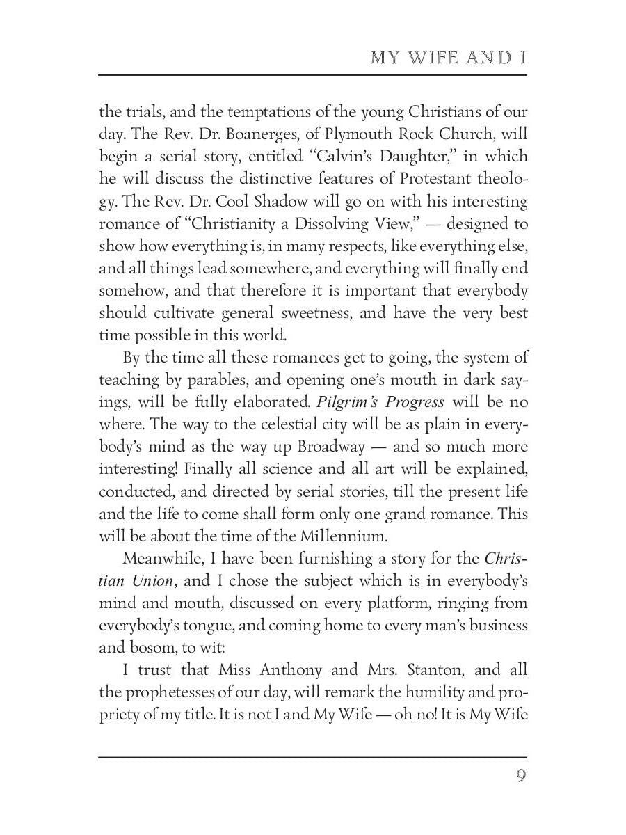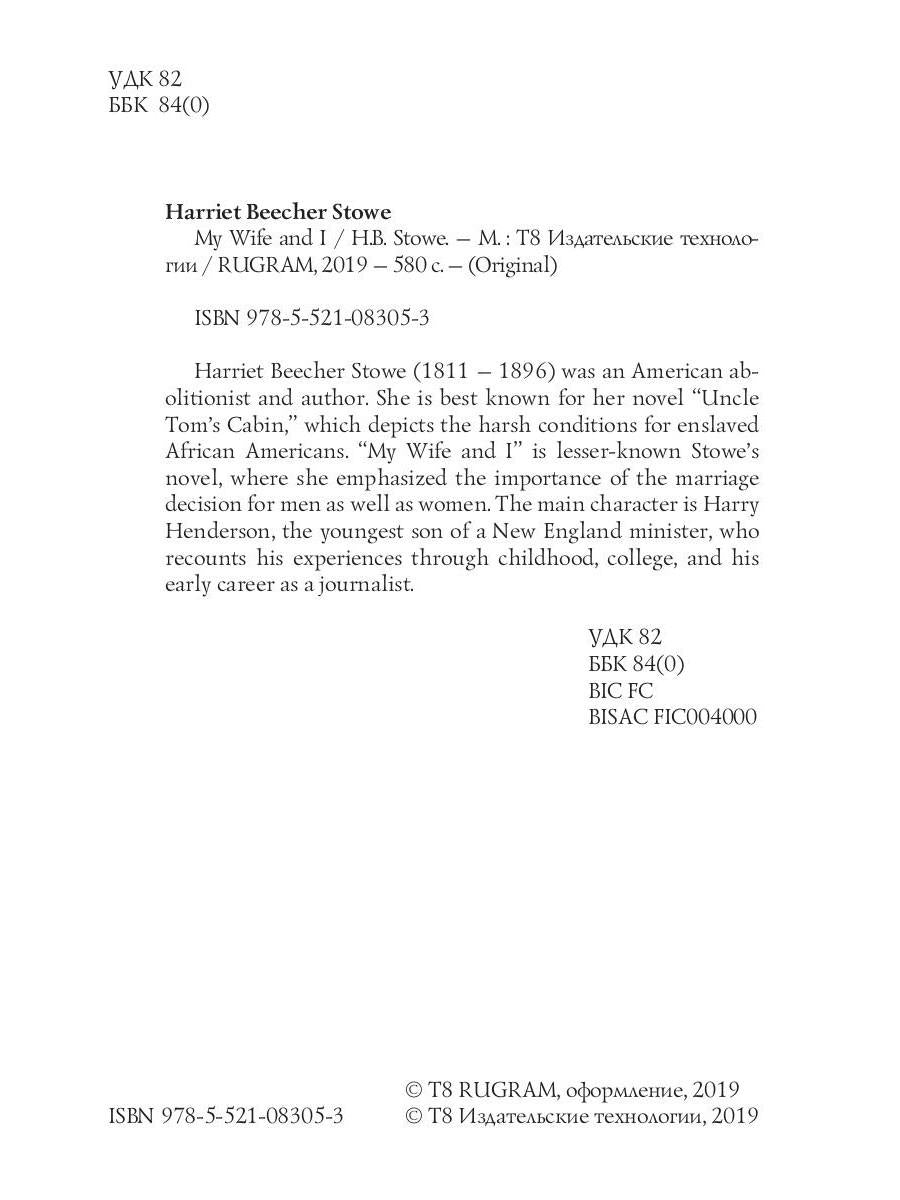 Auteur : Stowe H., « Ma femme et moi » : Harriet Beecher Stowe (1811 — 1896) était une abolitionniste et écrivaine américaine. Elle est surtout connue pour son roman « La Case de l'oncle Tom », qui décrit les dures conditions de vie des Afro-Américains réduits en esclavage. « Ma femme et moi » est un roman moins connu de Stowe, où elle souligne l'importance du mariage pour les hommes comme pour les femmes. Le personnage principal est Harry Henderson, le plus jeune fils d'un pasteur de Nouvelle-Angleterre, qui raconte son enfance, ses études supérieures et ses débuts de journaliste.
