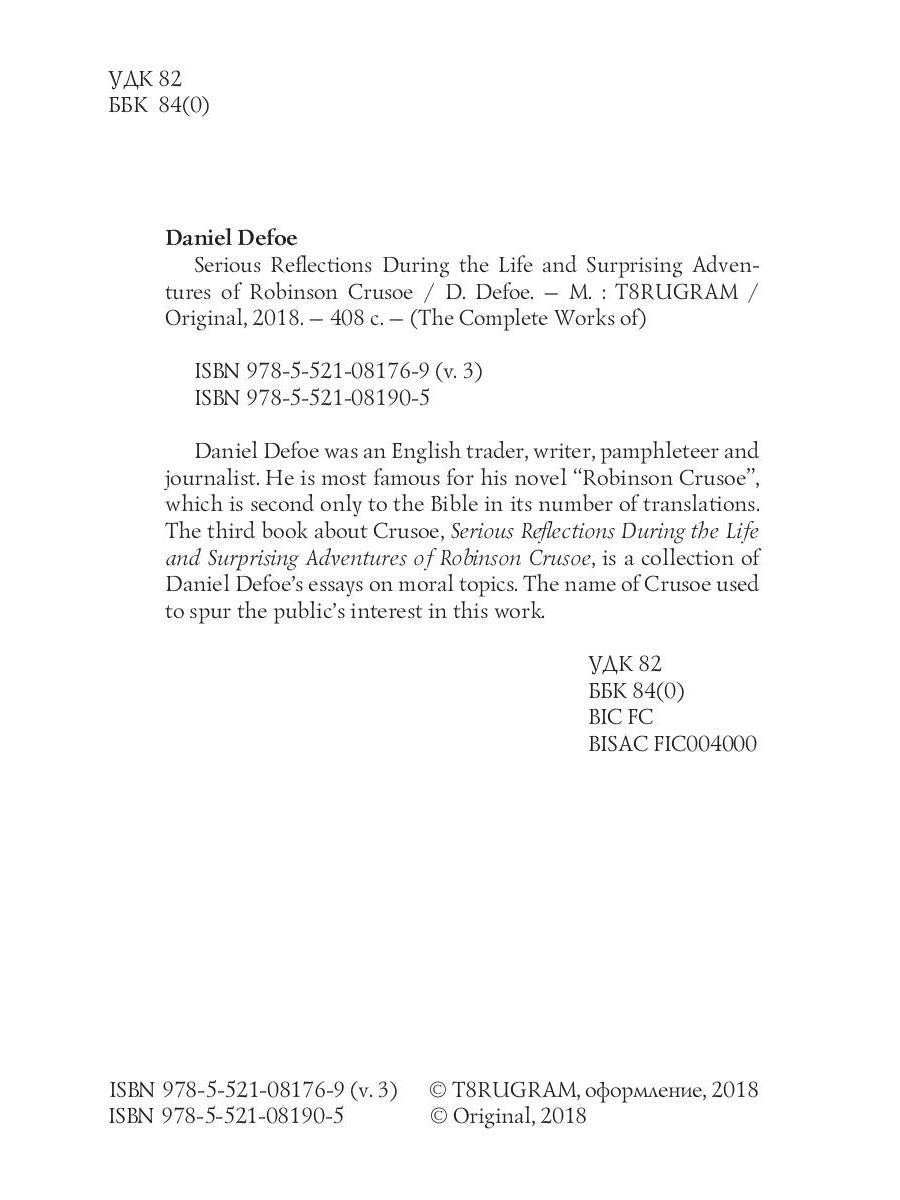 Auteur : Defoe Daniel, « Réflexions sérieuses sur la vie et les aventures surprenantes de Robinson Crusoé = Серьезные размышления Робинзона Крузо. T. 3: на англ.яз » : Daniel Defoe était un commerçant, écrivain, pamphlétaire et journaliste anglais. Il est surtout connu pour son roman « Robinson Crusoé », qui est le deuxième roman le plus traduit après la Bible. Le troisième livre sur Crusoé, Réflexions sérieuses sur la vie et les aventures surprenantes de Robinson Crusoé, est un recueil d'essais de Daniel Defoe sur des sujets moraux. Le nom de Crusoé a suscité l'intérêt du public pour cette œuvre.