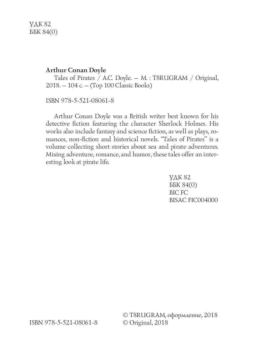 Auteur : Doyle Arthur Conan, « Contes de pirates. Рассказы пиратов (на английском языке) » : Arthur Conan Doyle était un écrivain britannique surtout connu pour ses romans policiers mettant en scène le personnage de Sherlock Holmes. Ses œuvres comprennent également de la fantasy et de la science-fiction, ainsi que des pièces de théâtre, des romances, des essais et des romans historiques. « Contes de pirates » est un recueil de nouvelles sur la mer et les aventures de pirates. Mêlant aventure, romance et humour, ces récits offrent un regard intéressant sur la vie des pirates.