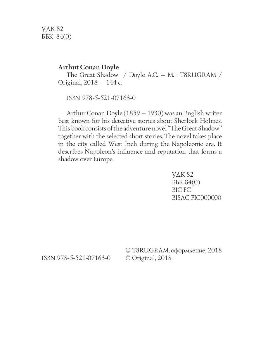 Auteur : Doyle Arthur Conan, « La Grande Ombre = Тень великого человека: на англ.яз » : Arthur Conan Doyle (1859 — 1930) était un écrivain anglais surtout connu pour ses romans policiers sur Sherlock Holmes. Ce livre se compose du roman d'aventure « La Grande Ombre » ainsi que des nouvelles sélectionnées. Le roman se déroule dans la ville appelée West Inch pendant l'ère napoléonienne. Il décrit l'influence et la réputation de Napoléon qui forment une ombre sur l'Europe.