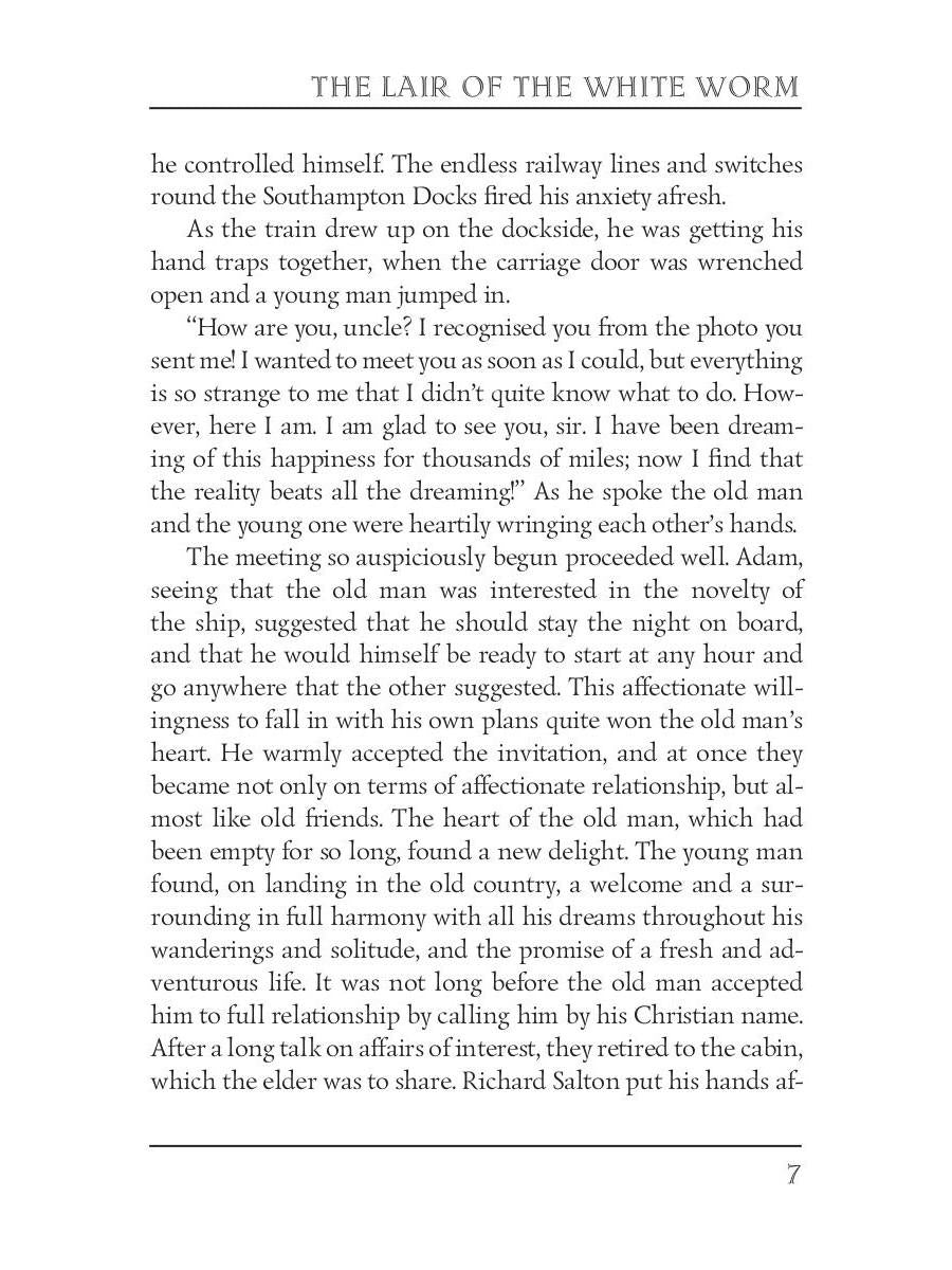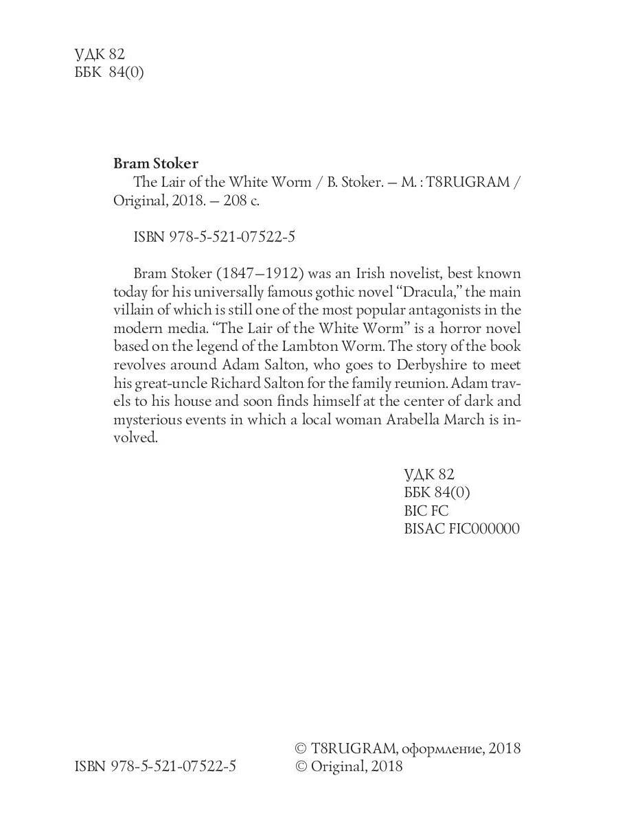 Auteur : Stoker B., « The Lair of the White Worm = Логово Белого червя: на англ.яз » : Bram Stoker (1847—1912) était un romancier irlandais, surtout connu aujourd'hui pour son roman gothique universellement célèbre « Dracula », dont le principal méchant est toujours l'un des antagonistes les plus populaires des médias modernes. « The Lair of the White Worm » est un roman d'horreur basé sur la légende du ver de Lambton. L'histoire du livre tourne autour d'Adam Salton, qui se rend dans le Derbyshire pour rencontrer son grand-oncle Richard Salton pour la réunion de famille. Adam se rend chez lui et se retrouve bientôt au centre d'événements sombres et mystérieux dans lesquels une femme de la région, Arabella March, est impliquée.