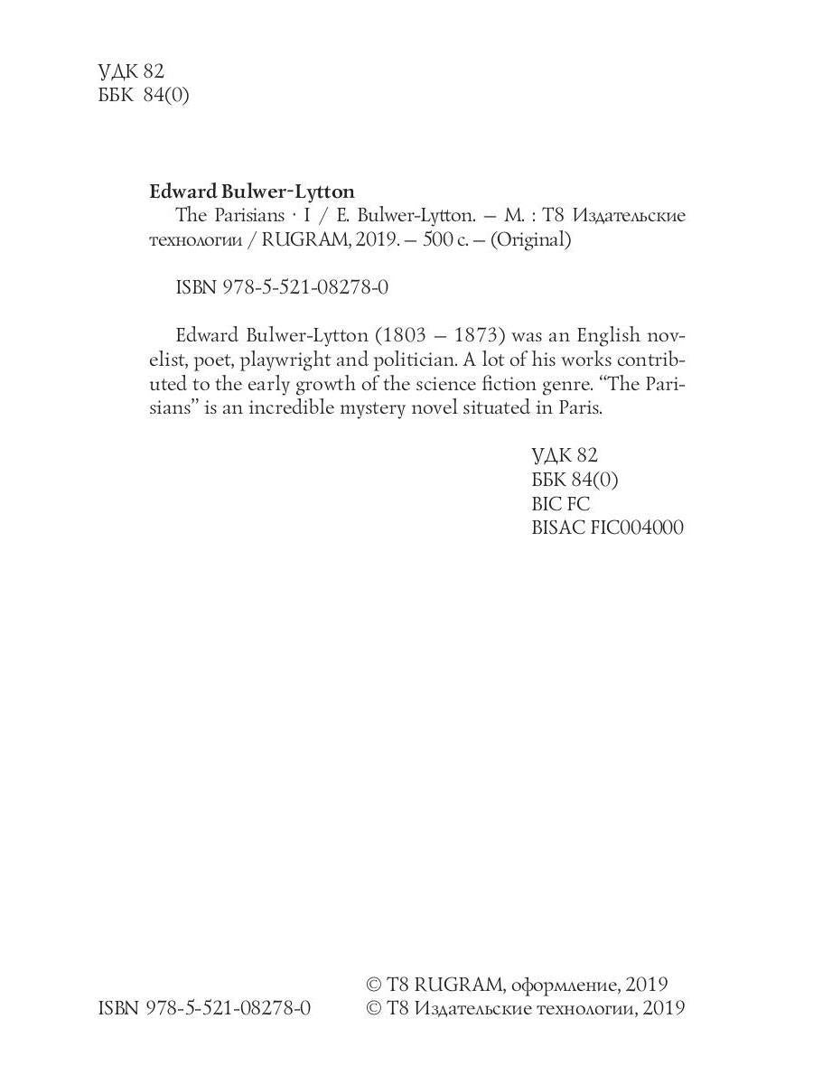 Auteur : Edward Bulwer-Lytton, « Les Parisiens I. Pari I (на английском языке) » : Edward Bulwer-Lytton (1803 — 1873) était un romancier, poète, dramaturge et homme politique anglais. Nombre de ses œuvres ont contribué à l'essor du genre de la science-fiction. « Les Parisiens » est un roman policier exceptionnel dont l'action se déroule à Paris.