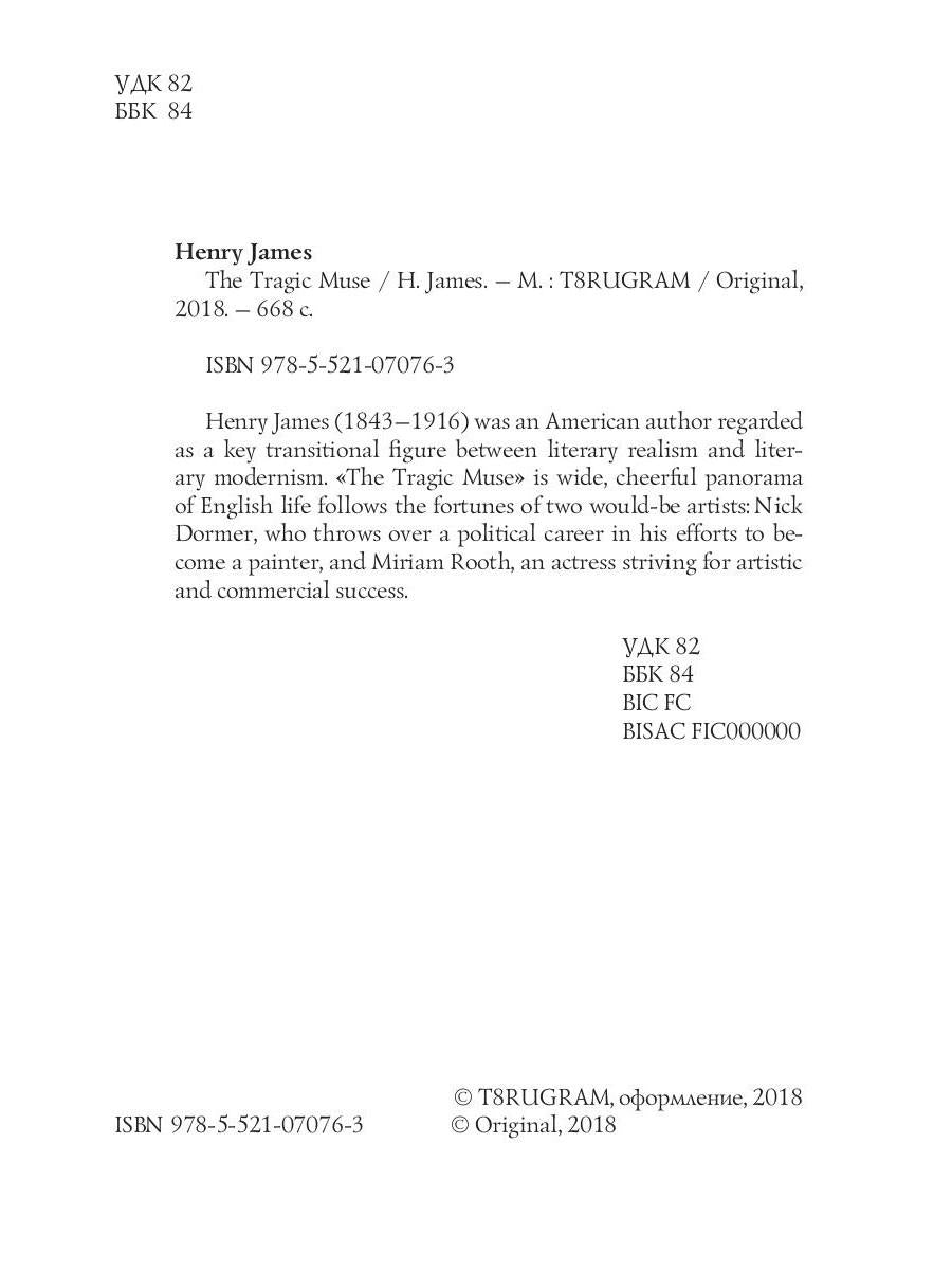 Auteur : James Henry, « The Tragic Muse = Трагическая муза (на английском языке) » : Henry James (1843—1916) était un écrivain américain considéré comme une figure clé de la transition entre le réalisme littéraire et le modernisme littéraire. « The Tragic Muse » est un panorama large et joyeux de la vie anglaise qui suit le destin de deux artistes en herbe : Nick Dormer, qui abandonne une carrière politique pour devenir peintre, et Miriam Rooth, une actrice en quête de succès artistique et commercial.