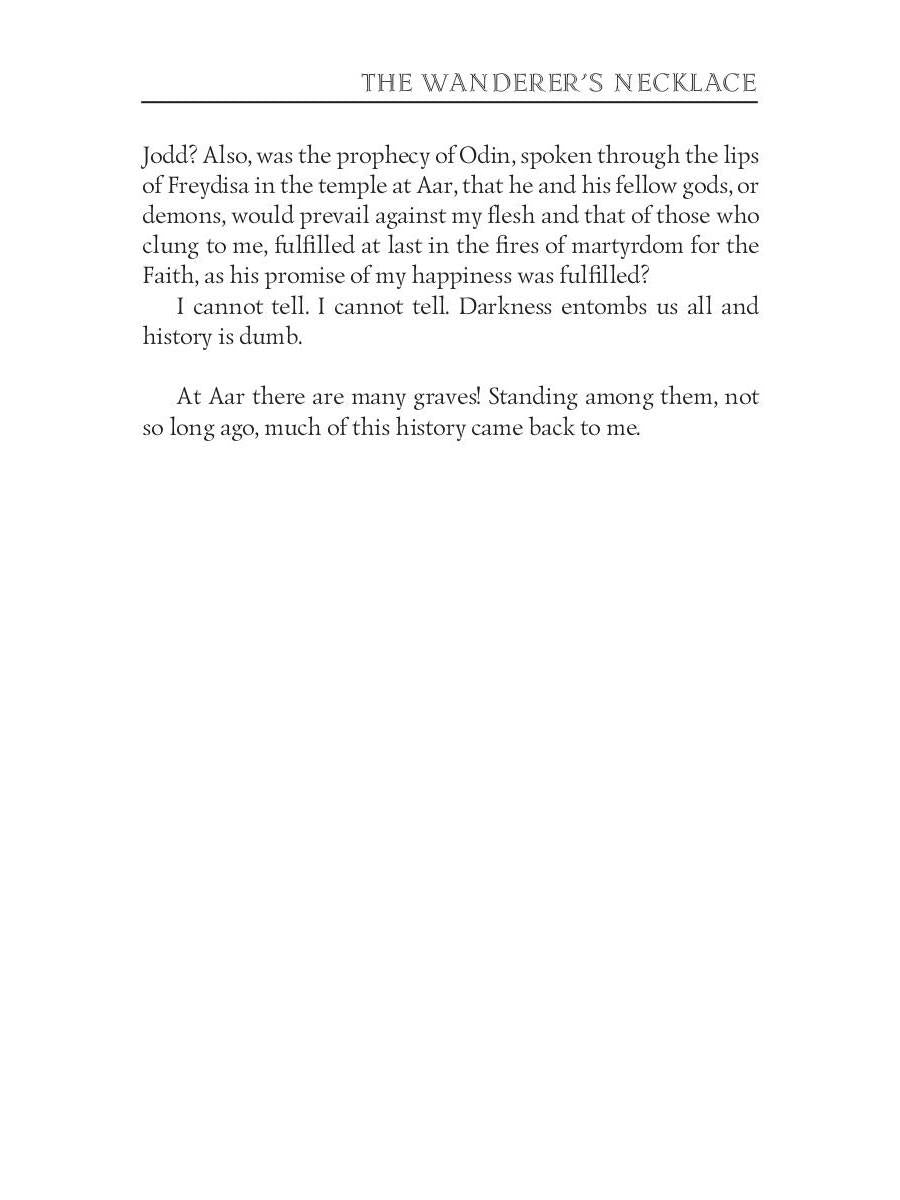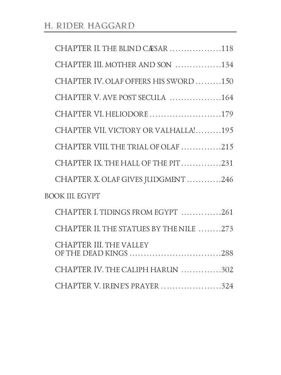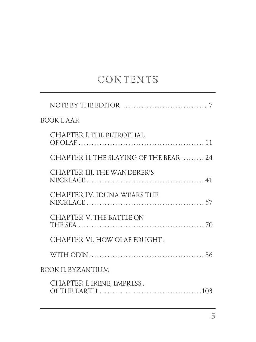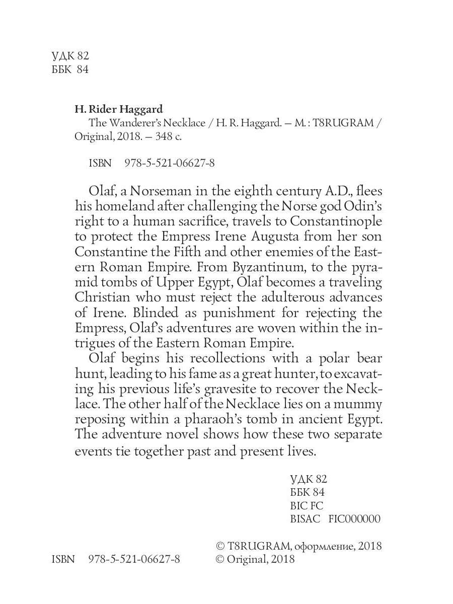 Auteur : Haggard HR, « The Wanderer's Necklace = Ожерелье странника: роман на англ.яз » : Olaf, un Nordique du VIIIe siècle après J.-C., fuit sa patrie après avoir contesté le droit du dieu nordique Odin à un sacrifice humain, se rend à Constantinople pour protéger l'impératrice Irène Augusta de son fils Constantin V et d'autres ennemis de l'Empire romain d'Orient. De Byzance aux tombeaux pyramidaux de Haute-Égypte, Olaf devient un chrétien itinérant qui doit rejeter les avances adultères d'Irène. Aveuglé en guise de punition pour avoir rejeté l'impératrice, les aventures d'Olaf se tissent au cœur des intrigues de l'Empire romain d'Orient. Olaf commence ses souvenirs par une chasse à l'ours polaire, qui le rendit célèbre comme grand chasseur, et l'obligea à fouiller le tombeau de sa vie antérieure pour retrouver le Collier. L'autre moitié du Collier repose sur une momie reposant dans la tombe d'un pharaon de l'Égypte antique. Ce roman d'aventures montre comment ces deux événements distincts relient vies passées et présentes.