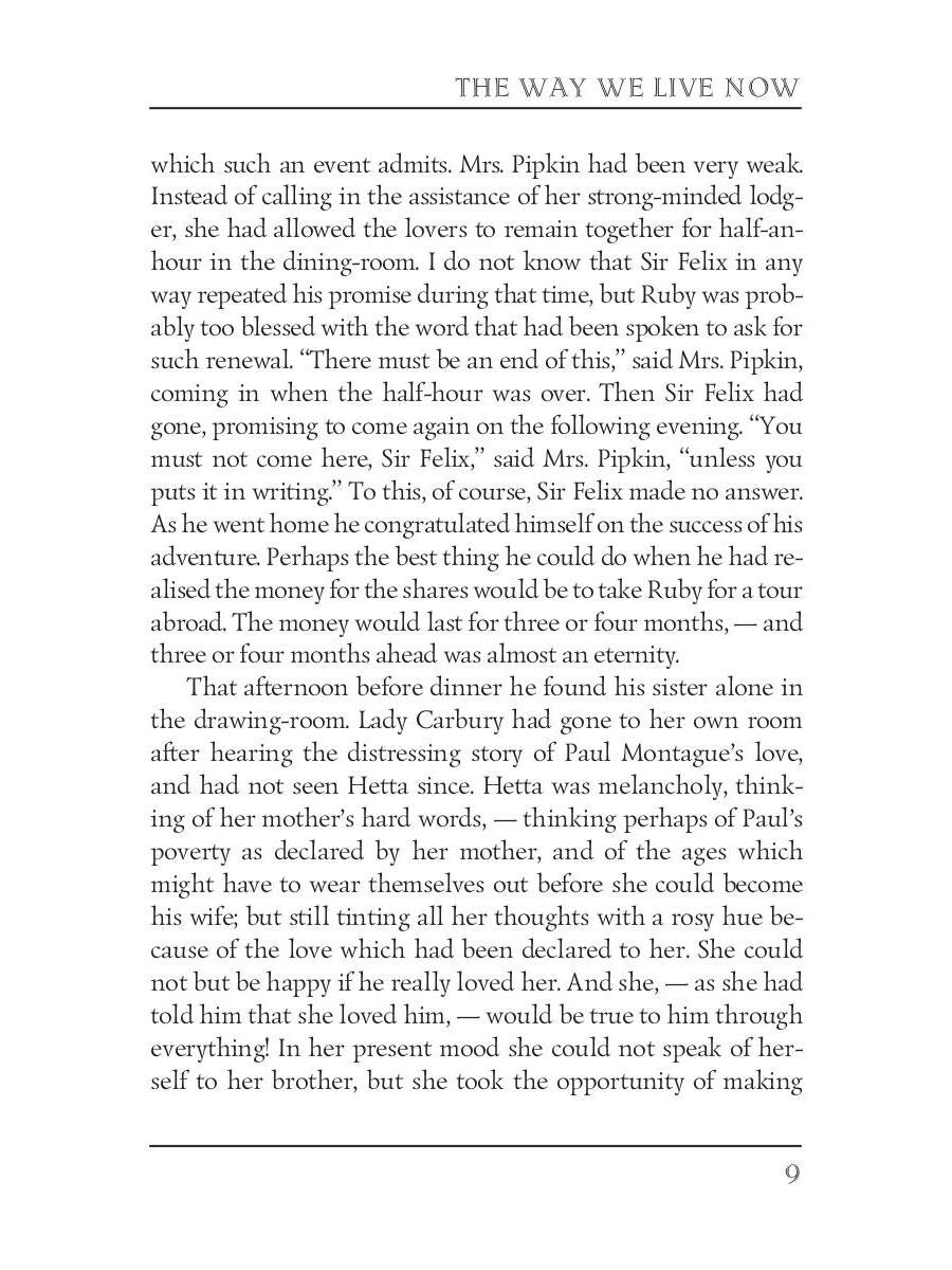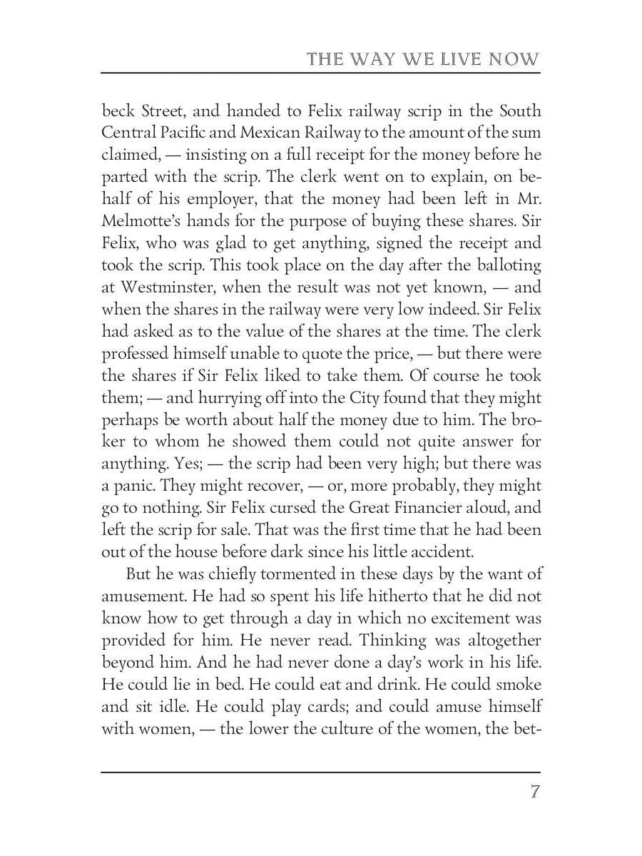 Auteur : Trollope A., « The Way We Live Now 3 = Как мы теперь живем 3 » : Anthony Trollope (1815-1882) était un romancier anglais de l'époque victorienne. Parmi ses œuvres les plus connues figure une série de romans connus sous le nom de Chroniques du Barsetshire, qui se déroule dans le comté imaginaire de Barsetshire. « The Way We Live Now » est un roman satirique, publié à Londres en 1875 après une première parution en feuilleton. Le personnage principal de l'histoire, Augustus Melmotte, est un financier au passé mystérieux. On raconte qu'il est d'origine juive et qu'il est lié à des entreprises viennoises en faillite. Lorsqu'il déménage son entreprise et sa famille à Londres, des rumeurs circulent à son sujet dans la haute société de la ville.