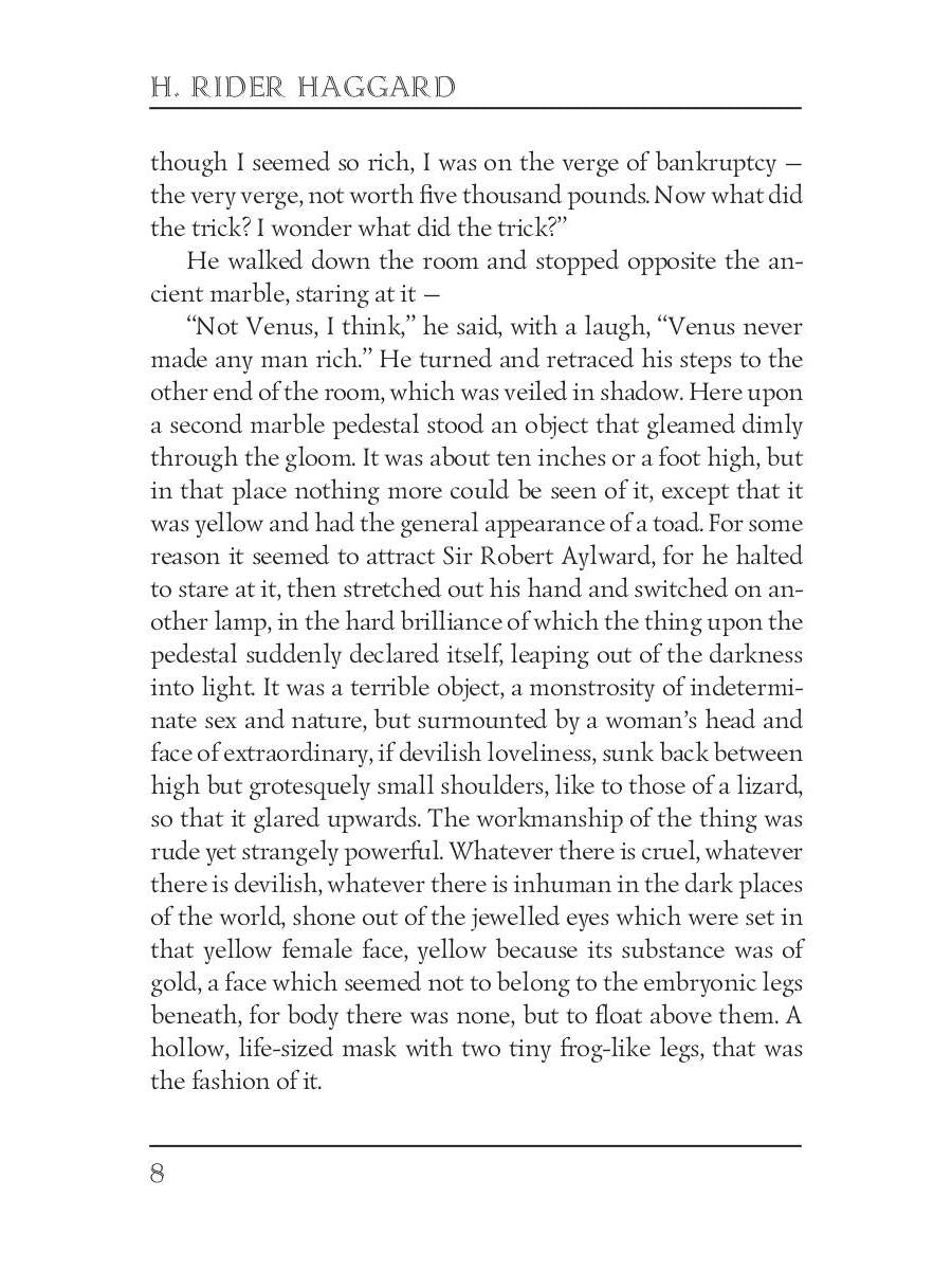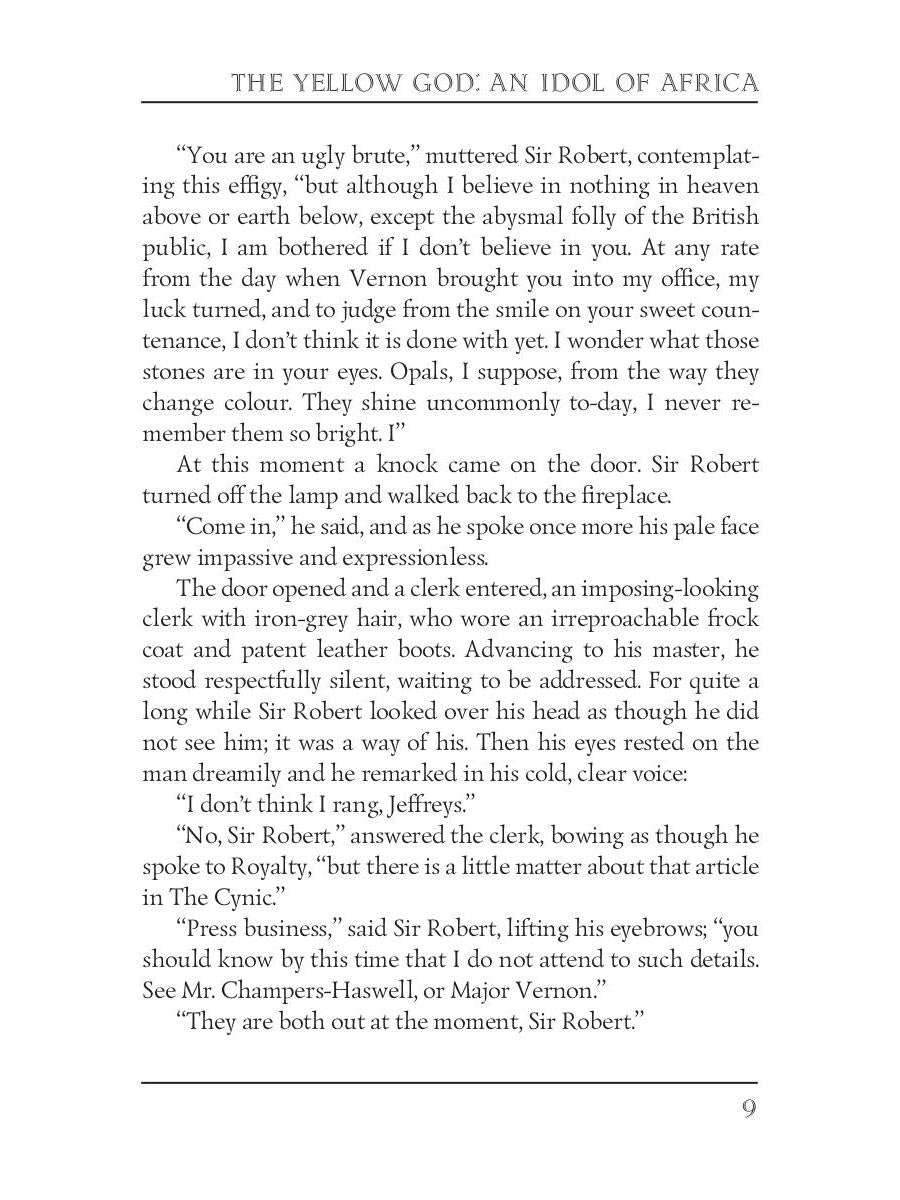 Auteur : Haggard HR, « The Yellow God: An Idol of Africa = Желтый бог: африканский идол: на англ.яз » : Le héros de l'histoire est Alan Vernon, un jeune major de l'armée à la retraite, qui, après avoir subi une ruine financière, décide de se rendre en Afrique pour faire fortune, dans l'espoir de gagner un jour la main de la belle Barbara Champers-Haswell. Vernon a entendu parler d'un royaume mystérieux dirigé par la prêtresse et prévoit de se servir de l'or qui s'y trouve.