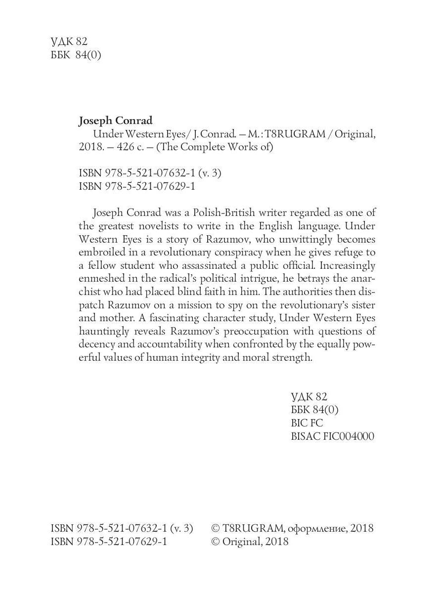 Auteur : Conrad J., « Under Western Eyes = На взгляд запада: на англ.яз » : Joseph Conrad était un écrivain polono-britannique considéré comme l'un des plus grands romanciers de langue anglaise. Under Western Eyes raconte l'histoire de Razumov, qui se retrouve involontairement impliqué dans une conspiration révolutionnaire lorsqu'il donne refuge à un camarade étudiant qui a assassiné un fonctionnaire. De plus en plus empêtré dans les intrigues politiques du radical, il trahit l'anarchiste qui avait placé une confiance aveugle en lui. Les autorités envoient alors Razumov en mission pour espionner la sœur et la mère du révolutionnaire. Une étude de personnage fascinante, Under Western Eyes révèle de manière obsédante la préoccupation de Razumov pour les questions de décence et de responsabilité lorsqu'il est confronté aux valeurs tout aussi puissantes de l'intégrité humaine et de la force morale.