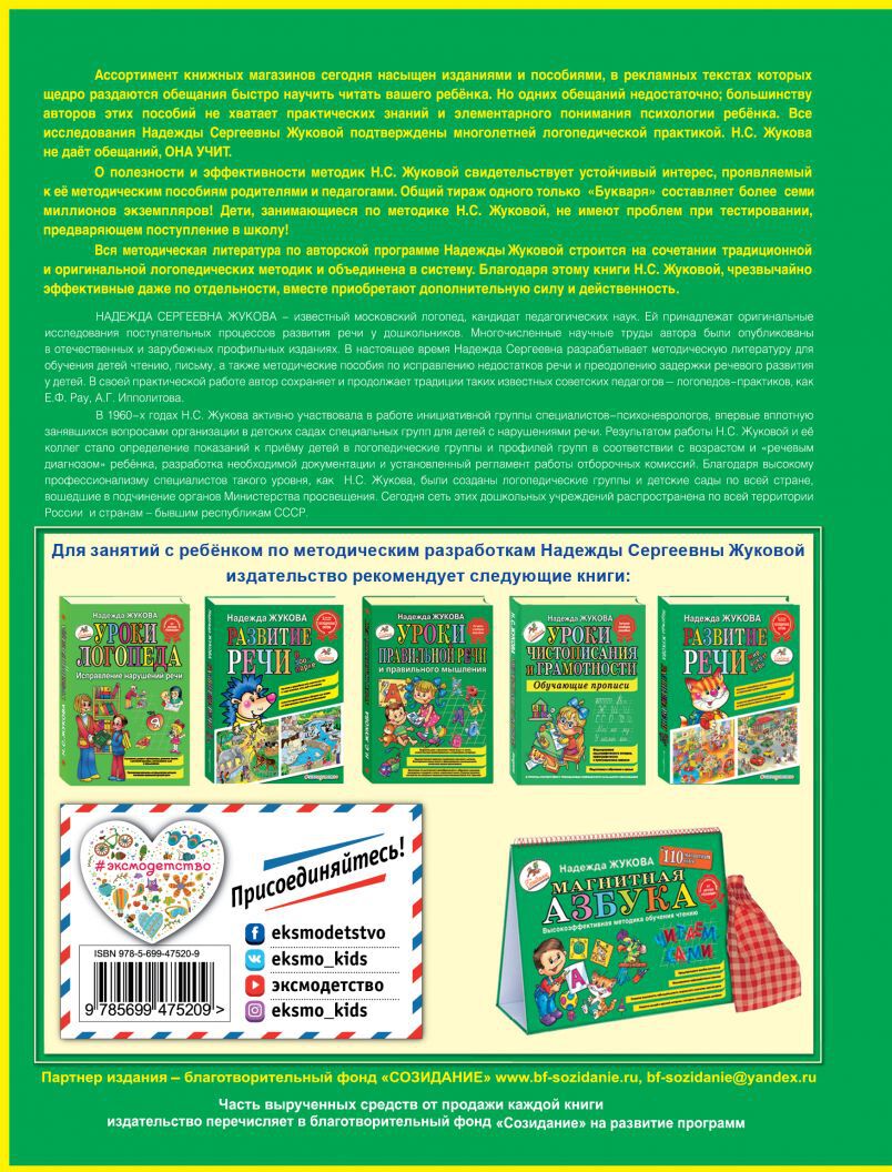 Для правильного чтения и письма, а также исправления ошибок в речи, для детей необходима только проверенная и прогрессивная, основанная на многолетнем опыте методика.Надежда Сергеевна Жукова — известный логопед, кандидат педагогических наук, приверженец классической педагогики. В своих книгах она использовала как исследования известных логопедов, так и самостоятельно разработанные оригинальные методики, проверенные временем.Имея большой практический опыт работы с особенными, «трудными» детьми, Надежда Сергеевна создала методику, доступную каждому, уйдя от «наукообразности» и «заумности». Все, кто когда-либо работал с ребенком по пособиям Надежды Жуковой, отмечают простоту подачи материала, легкость усвоения малышами и быструю обучаемость.«Букварь» — пример классического учебного пособия, по которому успешно выучились уже три поколения детей.Книга уменьшенного формата легче — и в портфеле много места не занимает, и в дороге обучаться помогает.Если вы захотите продолжить занятия с ребенком по авторской программе Н.С. Жуковой, издательство «ЭКСМО» рекомендует вам обратить внимание на следующие книги:- «Букварь»,- «Первая после букваря книга для чтения»,- «Уроки чистописания и грамотности»,- «Я говорю правильно»,- «Я пишу правильно»,- «Уроки логопеда».