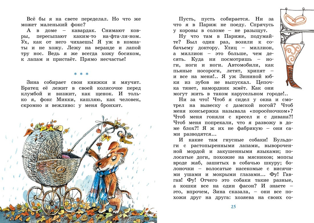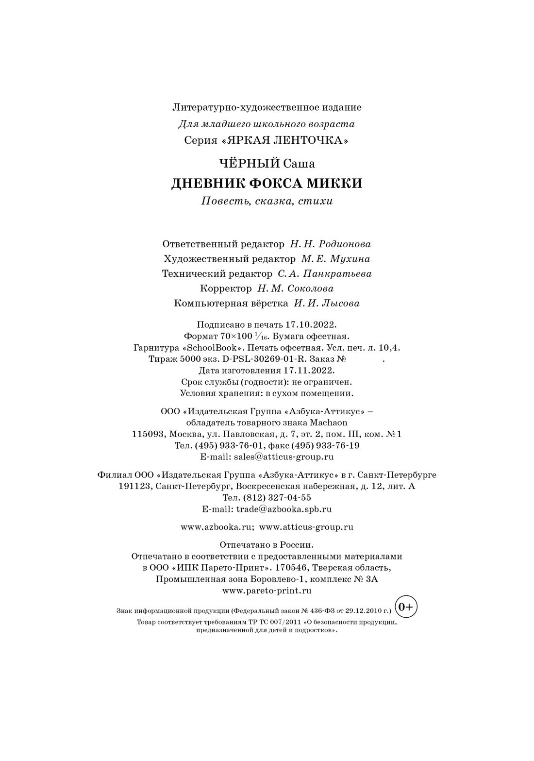 Саша Чёрный - знаменитый русский поэт Серебряного века, получивший мировую славу в том числе и как автор произведений для детей. Для них он писал сказки, рассказы, повести, стихи. Пожалуй, одна из самых известных его повестей - "Дневник фокса Микки", в которой речь идёт от лица забавного пса Микки, обладающего великолепным чувством юмора. В ироничной манере он рассказывает о своей полной событий собачьей жизни, о маленькой хозяйке Зине, обо всём, что его окружает. Дети обязательно полюбят этого необыкновенного рассказчика. Кроме того, в книгу вошли сказка "Красный камешек" и весёлые стихи.Для детей младшего школьного возраста. Пять причин купить 1Автор - знаменитый русский писатель, который на весь мир прославился своим неповторимым чувством юмора и умением с иронией подходить к жизненным неурядицам. 2Повествование ведется от лица фокстерьера Микки - первой интеллигентной собаки, которая умеет читать, писать и даже сочинять стихи. 3Книга актуальна: несмотря на то что автор создавал ее несколько десятков лет назад, складывается ощущение, что она написана сегодня. 4Отрываться от чтения придется только для того, чтобы от души посмеяться, в других случаях убирать книгу в сторону просто не захочется. 5Тонкая ирония автора заставит с интересом вчитываться в текст не только детей, но и их родителей, поэтому книга подойдет для любого возраста.