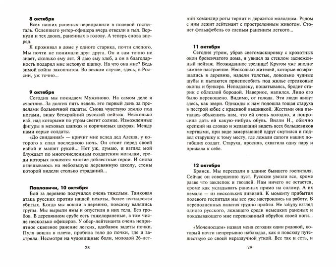 Записки Хайнца Килера — еще один ценный документ, свидетельствующий о фронтовых буднях Второй мировой войны. Ефрейтор Хайнц Килер служил санитаром в немецком военном госпитале. Свой дневник он начал в сентябре 1941 г. — в то время, когда немецкие войска вплотную подошли к Москве. День за днем Килер ухаживал за ранеными, наблюдая кровавые раны, смерть, болезни и голод. Мирный человек в душе, он все больше проникается отвращением к войне, к тому, как она разрушает душу и жизнь тех, кто в нее, так или иначе, втянут. Он не может понять, зачем людей принуждают убивать друг друга, и говорит самому себе: «Мы должны стремиться не к завоеванию мира, а служить ему».