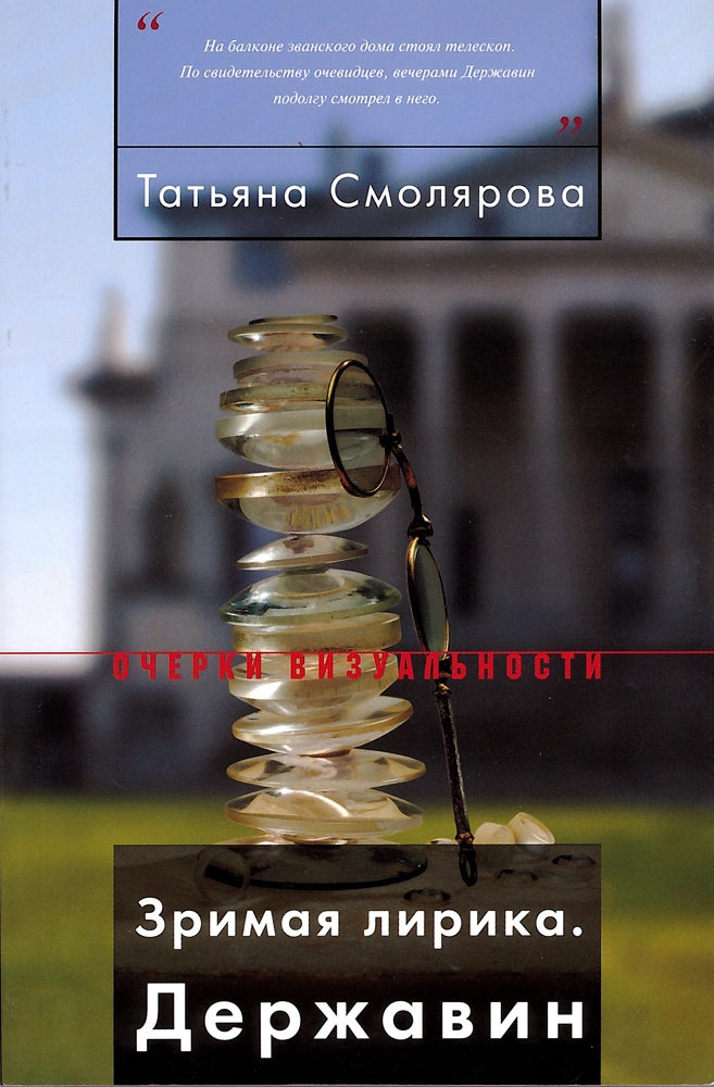 Книга Татьяны Смоляровой "Зримая лирика. Державин" явно шире своего названия. Барочной природе исследуемых стихов соответствует барочное развертывание текста — по разным направлениям и неожиданным контекстам, с включением в орбиту повествования далеких фигур и парадоксальных сюжетных ответвлений. Одним героем книги, безусловно, является поэт Державин, другим же — сама природа видения и наблюдения, претерпевающая культурные метаморфозы.