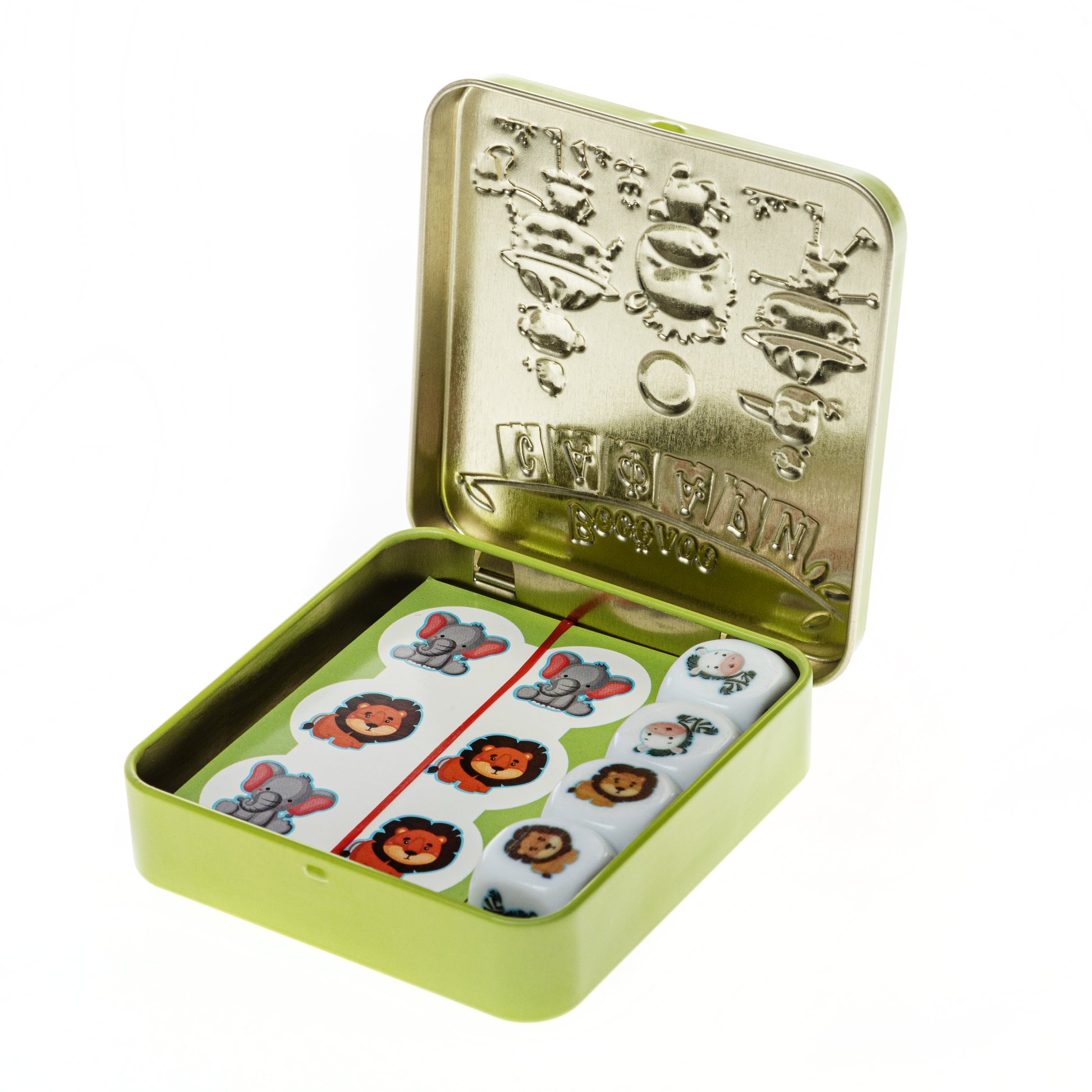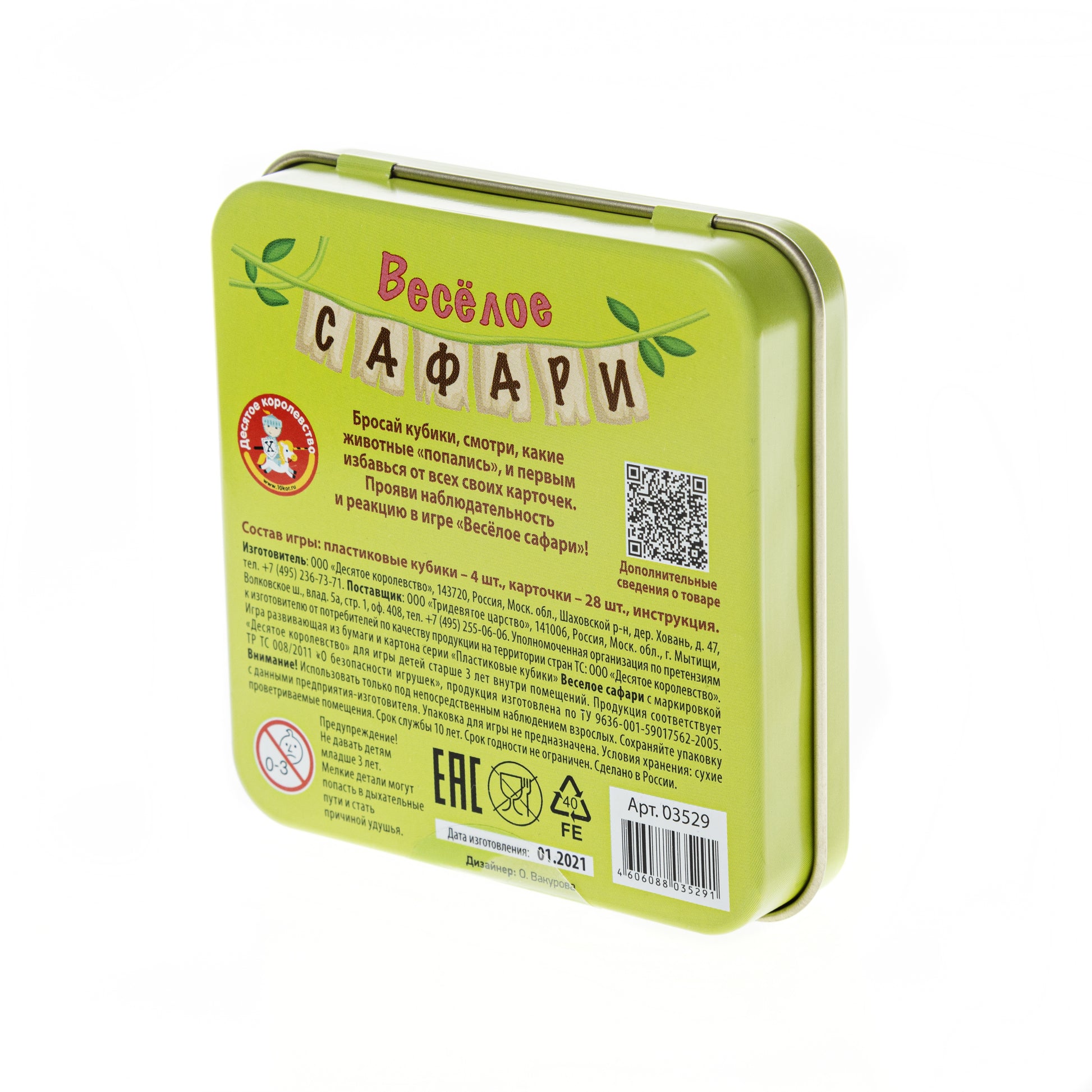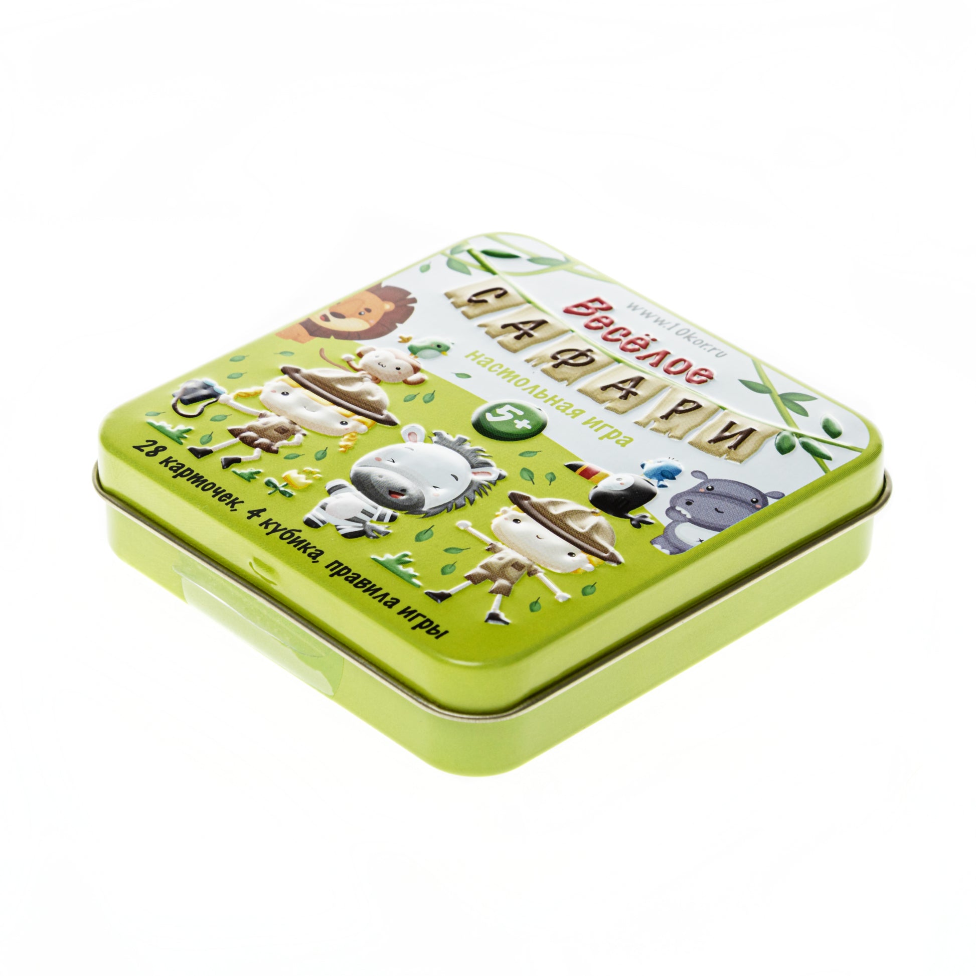 Handling time: 24 days Настольная развлекательная игра «Весёлое сафари» в жестяной коробочке (серия «Игры в табакерке»). Состав: карточки – 28 шт. (87 х 56 мм), кубики – 4 шт. (18 х 18 мм), правила игры. Материалы: пластмасса, картон, бумага. Для детей от 5 лет, от 2 до 4 игроков. Развивает наблюдательность и реакцию.