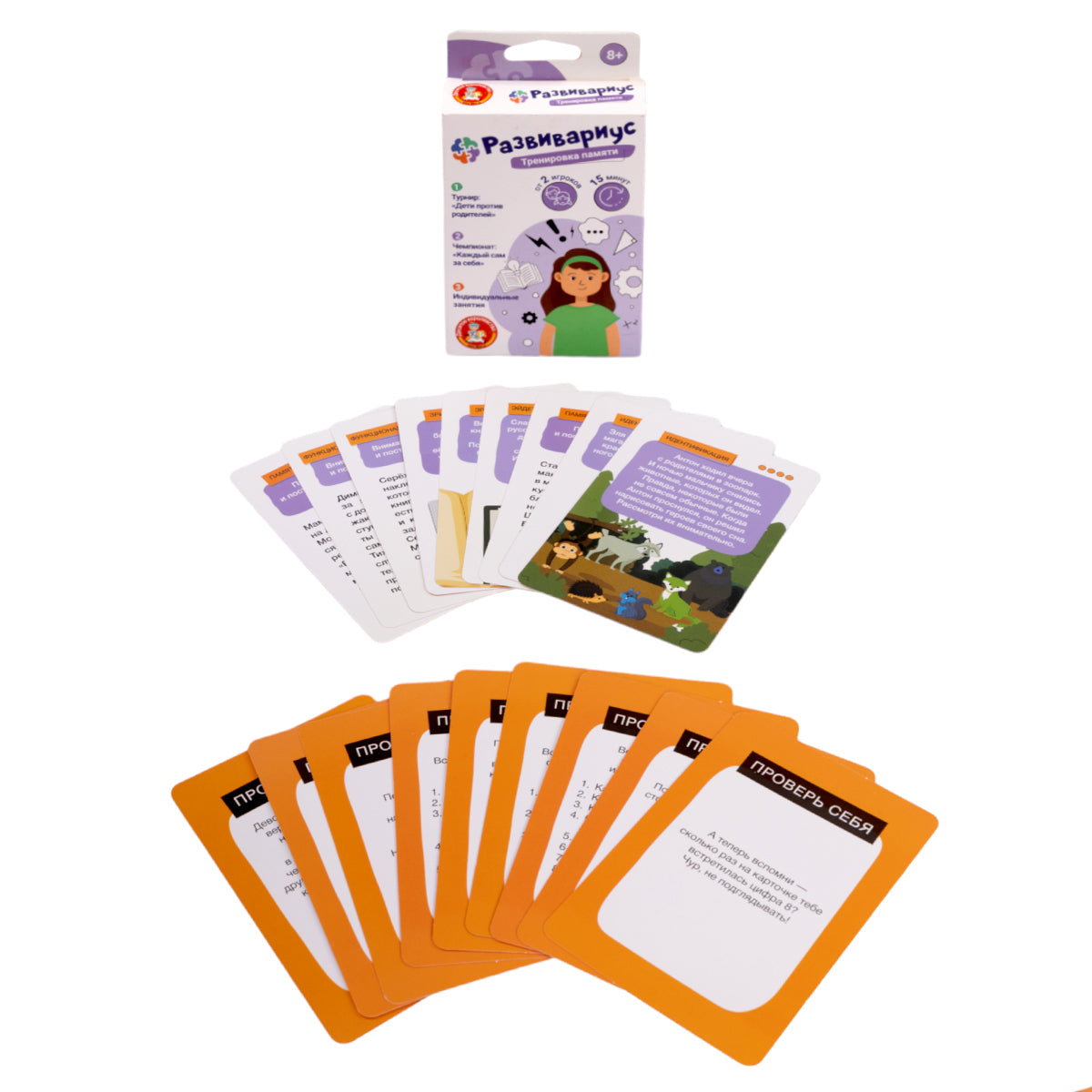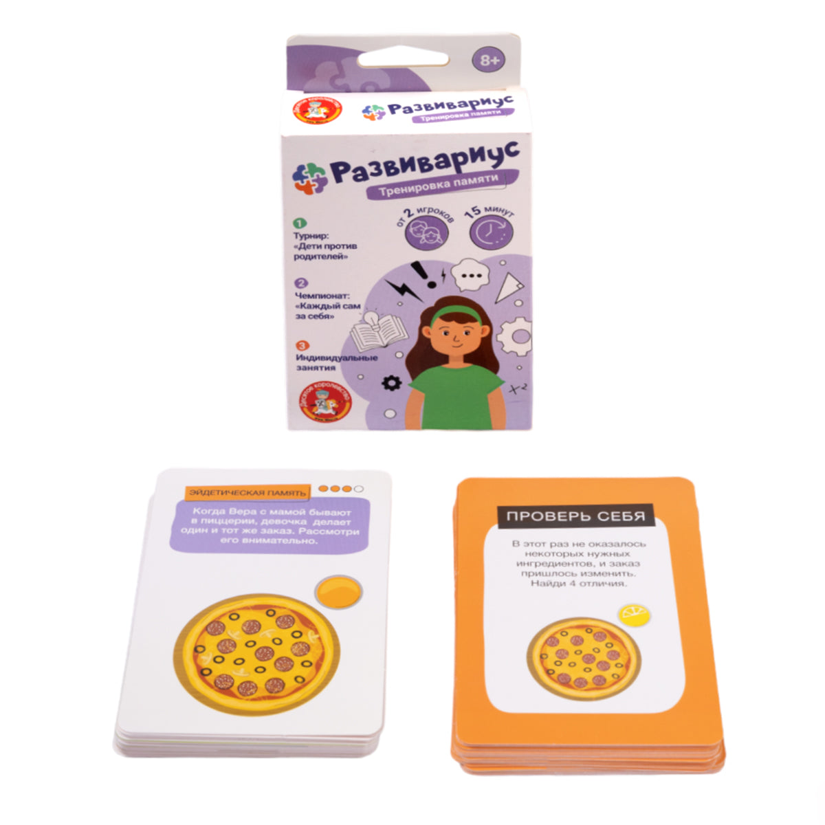 Handling time: 24 days Игра настольная "Развивариус" Тренировка памяти. Состав игры: картонные карточки - 64 шт.(8х11,8 см) , правила игры. Материалы: картон, бумага. Для детей старше 8 лет.
