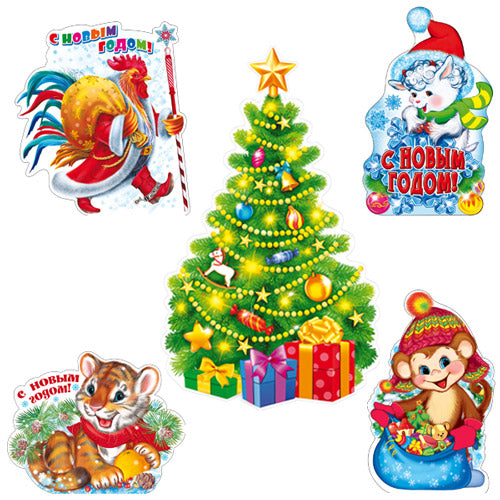 В комплект входят фигурный плакат формата А2 и 3 фигуры новогодних зверей формата А3.