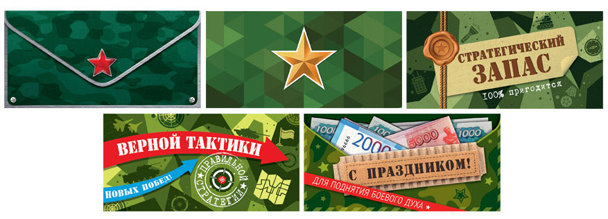 В комплект входят 5 видов мужских конвертов на склейке. Полный состав: — КДС-16926 Конверт для денег на склейке. Без текста. Звезда — КДС-16927 Конверт для денег на склейке. Без текста. Звезда — КДС-16929 Конверт для денег на склейке. Стратегический запас. 100% пригодится — КДС-16931 Конверт для денег на склейке. Верной тактики. Новых побед! — КДС-16933 Конверт для денег на склейке. С праздником! Для поднятия боевого духа В составе комплекта возможны незначительные изменения.