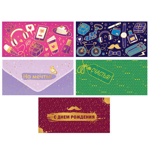 *КД-17582 Комплект конвертов для денег на склейке. С днем рождения: для него и для нее (5 шт., золотая фольга)