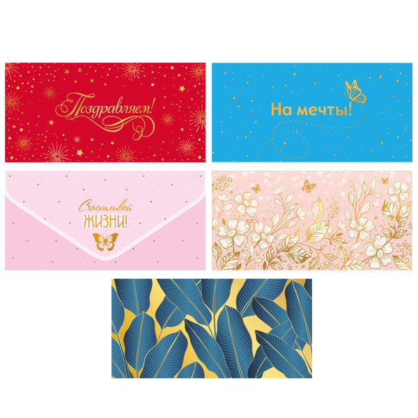 Комплект состоит из 5-ти видов конвертов на склейке, украшенных отделкой из золотой фольги: — КДС2-16064 Конверт для денег на склейке. Счастливой жизни! (золотая фольга) — КДС3-15809 Конверт для денег на склейке. На мечты! (софт-тач, золотая фольга) — КДС3-15815 Конверт для денег на склейке. Поздравляем! (софт-тач, золотая фольга) — КДС2-17128 Конверт для денег на склейке. Без текста (золотая фольга) — КДС2-16168 Конверт для денег на склейке. Без надписи. Женский (золотая фольга) В составе комплекта возможны незначительные изменения.