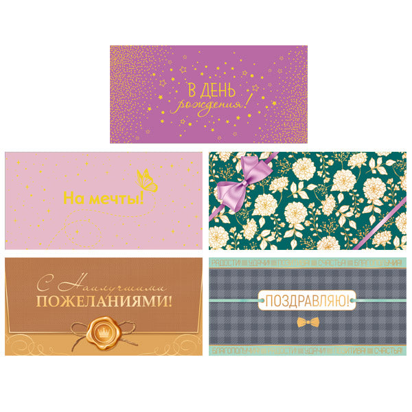 *КД-17584 Комплект конвертов для денег на склейке. С днем рождения: для него и для нее-2 (5 шт., золотая фольга)